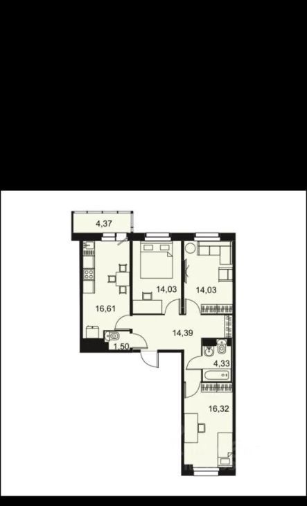 Общая площадь квартиры составляет 82 кв. м, из которых 44 кв. м — жилая площадь и 16.6 кв. м — кухня-гостинная, две комнаты по 14 м и спальня 16 м.