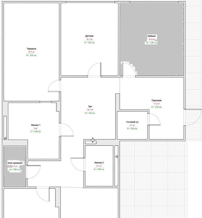 На планировке серым помечены комнаты(Кабинет и Зона хранения), которые будут недоступны.