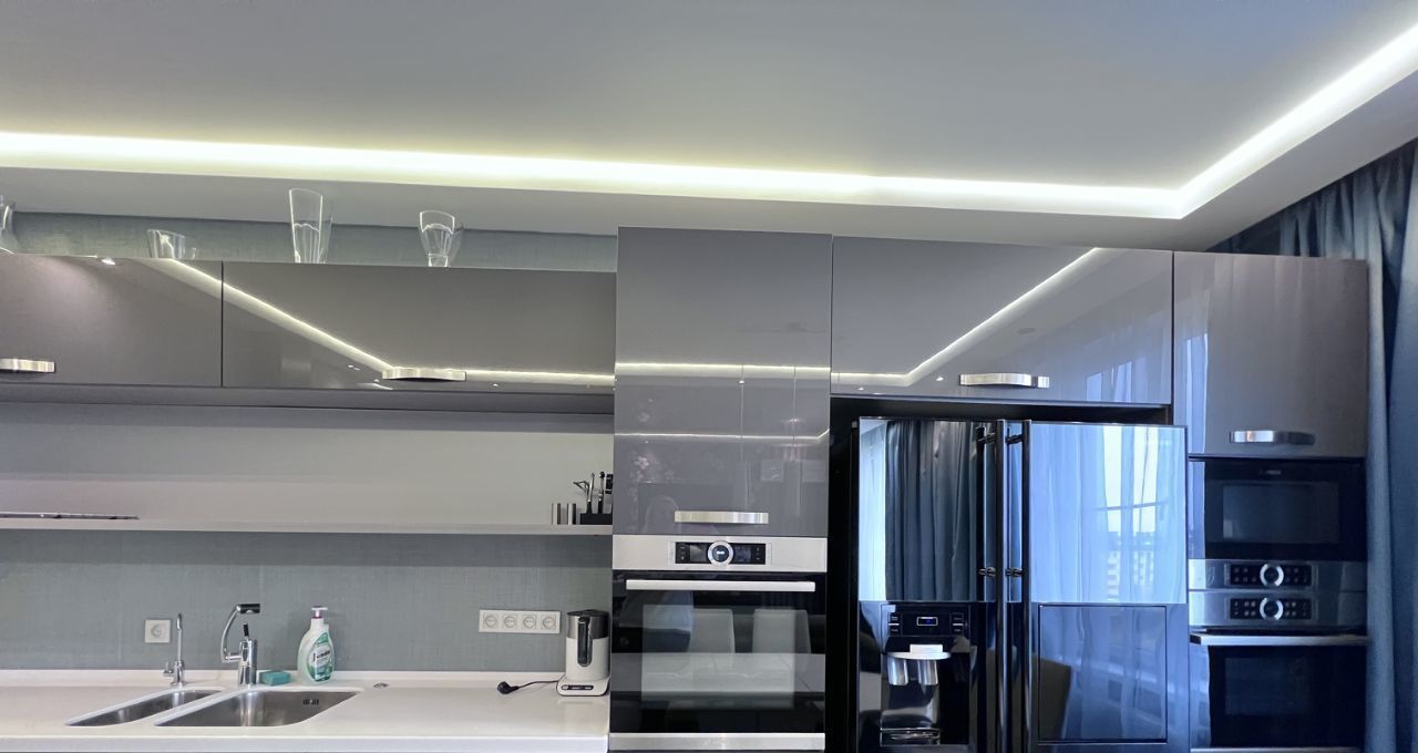 Встроенная кухня со всевозможной встроенной техникой, в том числе посудомоечной машиной, духовой печью, встроенной пароваркой и др