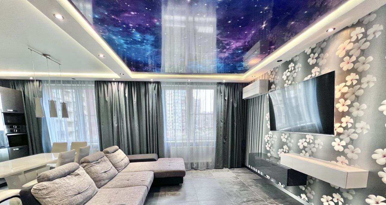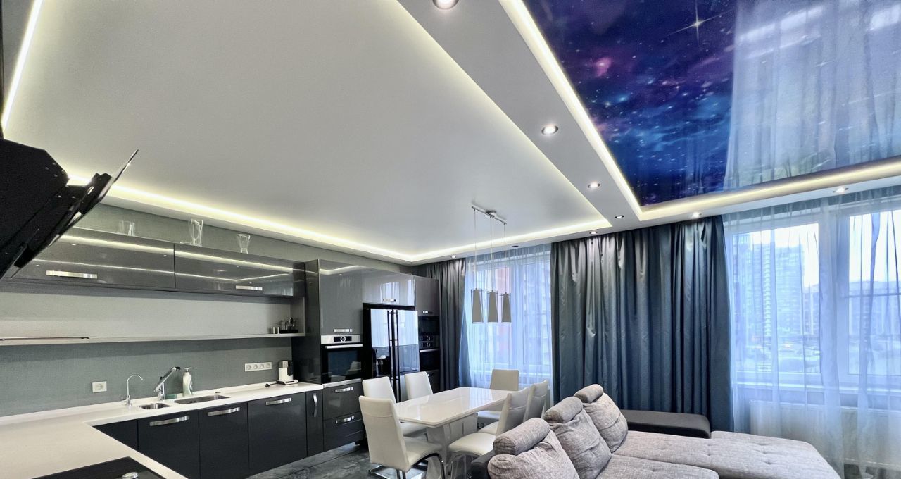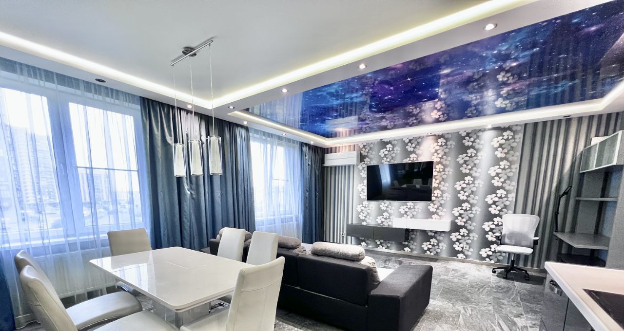 Квартира состоит из большой с двумя окнами кухни-гостиной 30 кв м, спальней 17 кв ми еще одной комнаты свободного назначения 13 кв м, два санузла, хозяйственная комната, две лоджии и большая прихожая. Квартира двухсторонняя.
