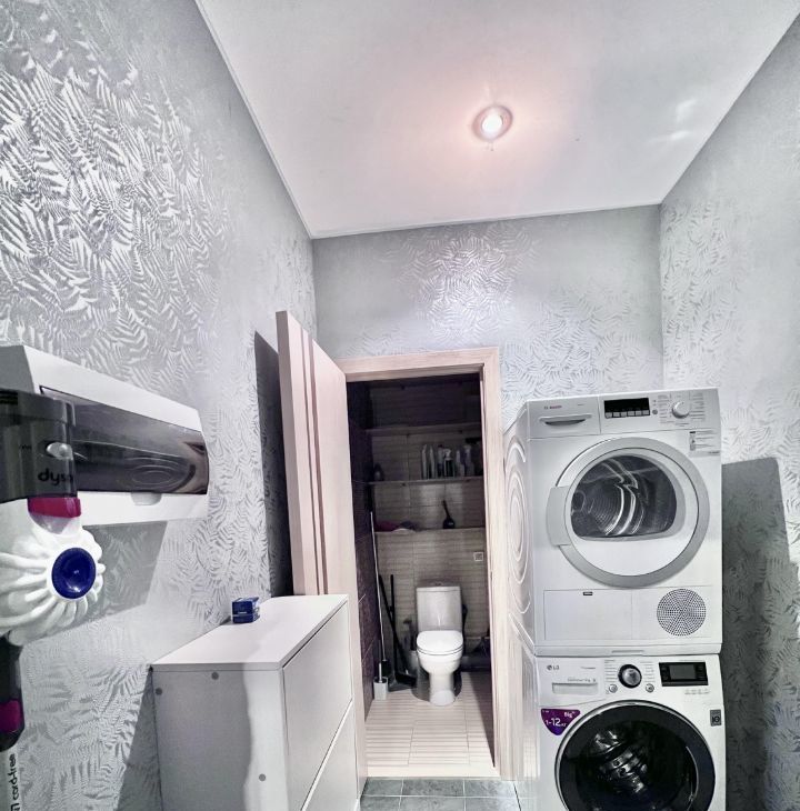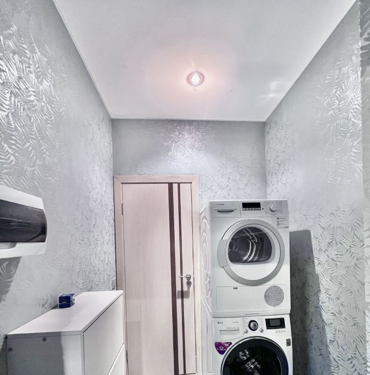 Помимо стиральной машины в хоз блоке стоит еще и сушильная. Кондиционер.