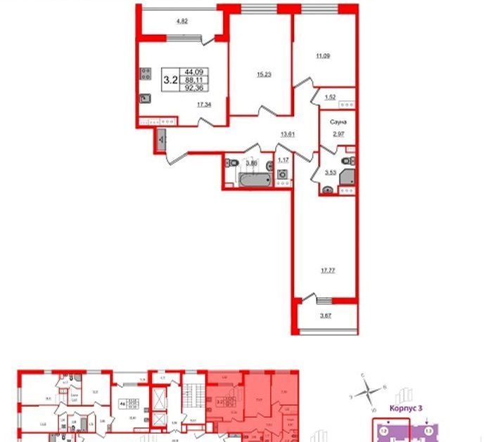 Продается просторная трехкомнатная квартира в современном жилом комплексе. Общая площадь — 92.36 кв.м, жилая площадь — 44.09 кв.м, кухня — 17.34 кв.м.