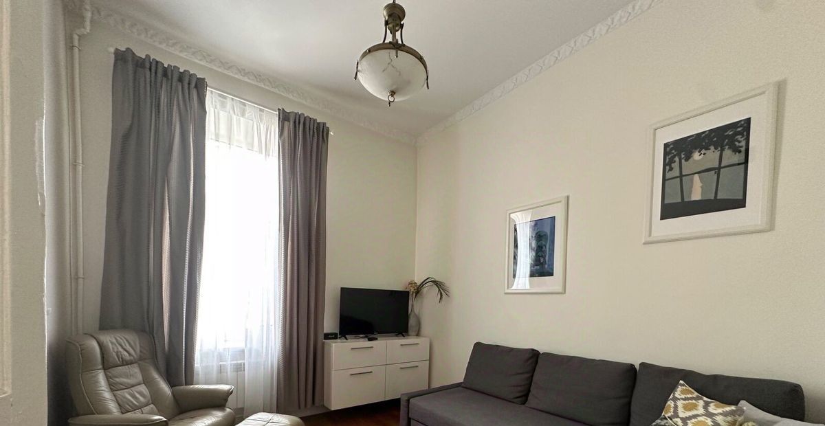 Дом 1874 года постройки — исторический фонд с капитальными стенами и особой атмосферой. При этом квартира находится на 4 этаже, что даёт хорошую видовую точку и избавляет от уличного шума. Площадь 37.9 м.кв.