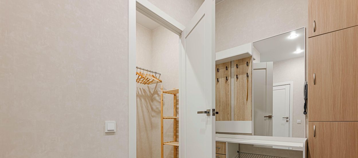 При входе в квартиру также еще одна одна просторная гардеробная. Ваши вещи всегда будут спрятаны от глаз гостей, а в квартире будет порядок.