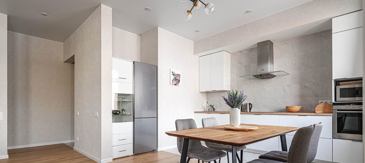 Европланировка - 3 комнаты и кухня-гостиная. Приятная отделка квартиры преимущественно в нейтральных тонах. Полы - паркетная дубовая доска и керамогранит (подогрев).