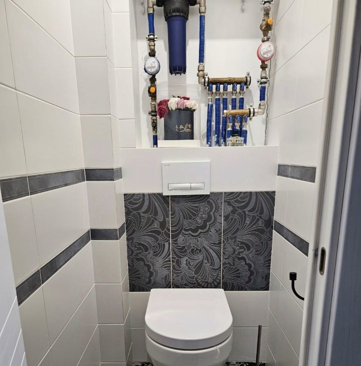 В санузлах стены кафель, теплый пол керамогранит, ванна "Kaldewei" 180х80 см (Германия), сантехника "Jakob Delafon" (Франция).