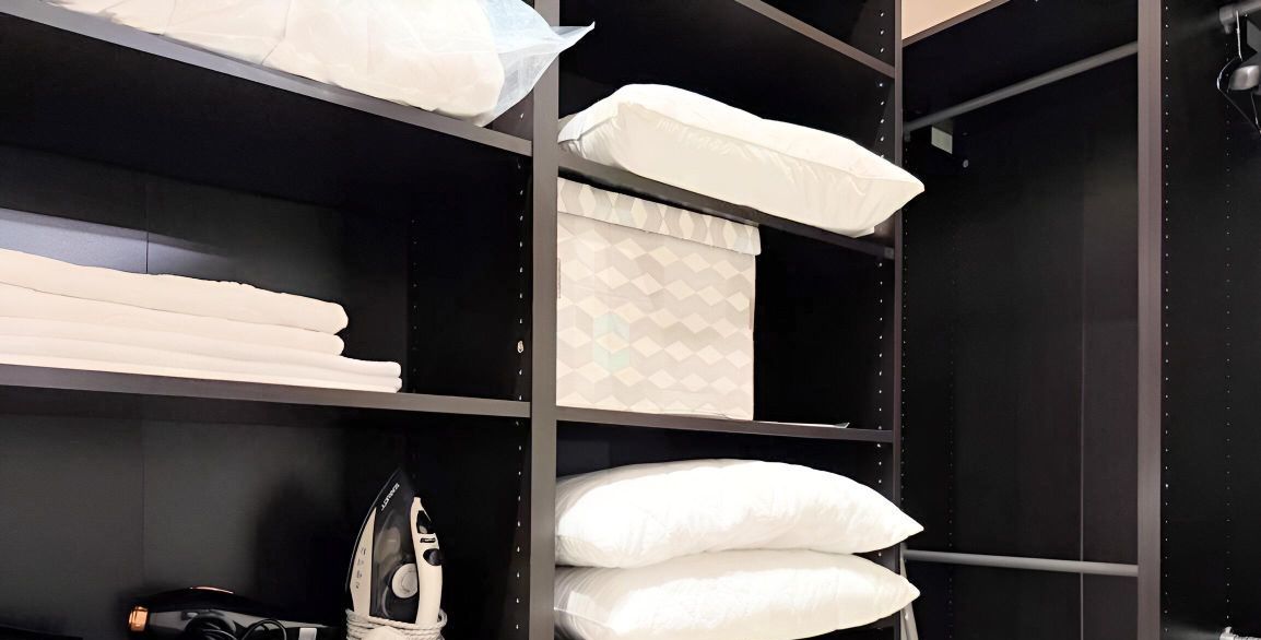 Есть гардеробная + вместительный шкаф для хранения + рейл для одежды в третьей спальне;