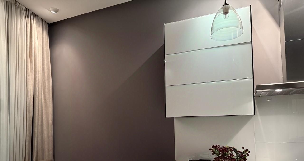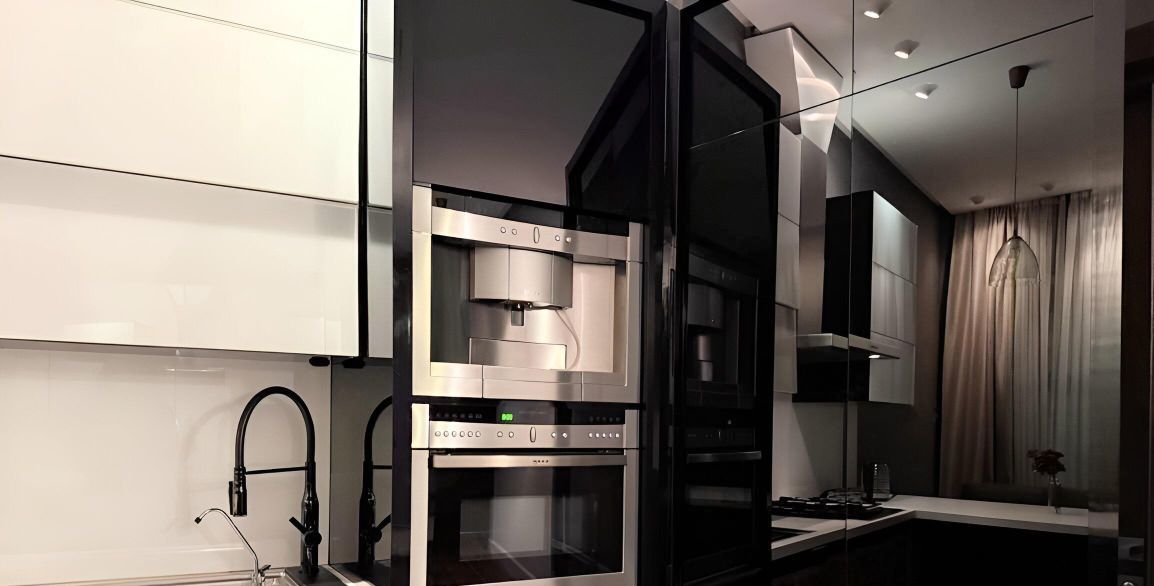 Удобный зеркальный шкаф для хранения в кухне-гостиной;