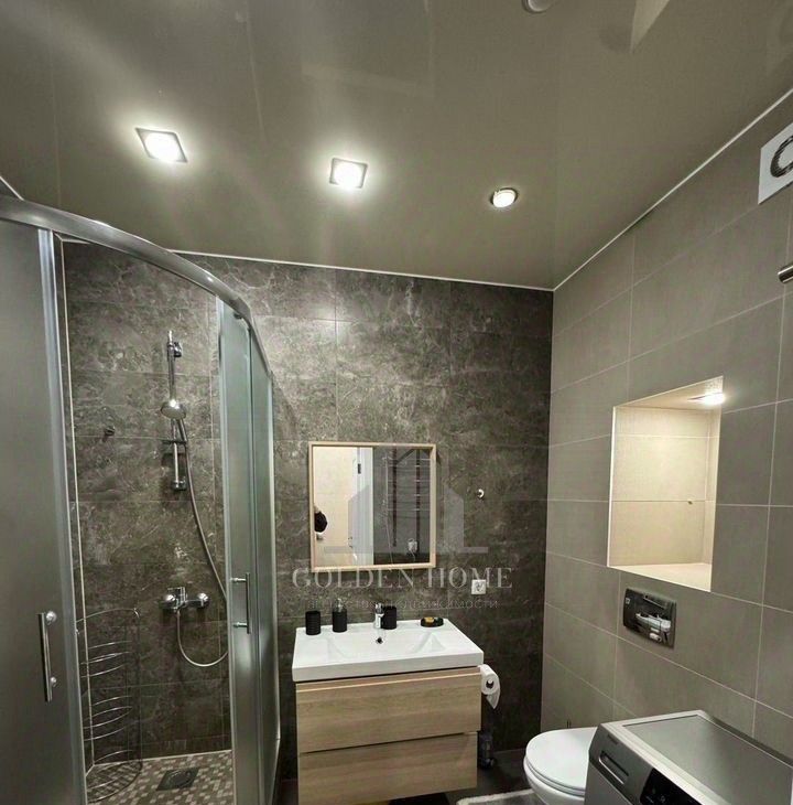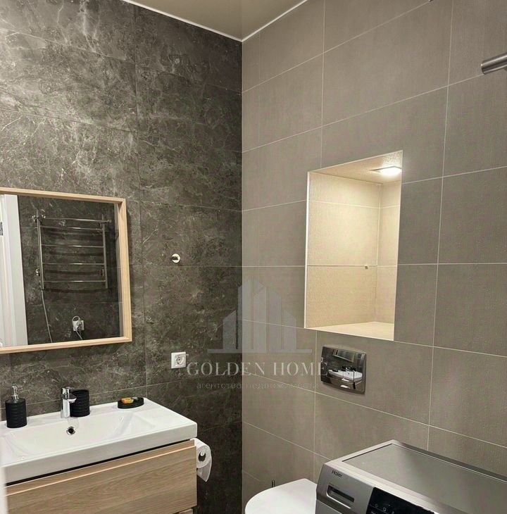 Кухня оборудована всей необходимой техникой. Санузел совмещенный, оснащён современной сантехникой и стиральной машиной.