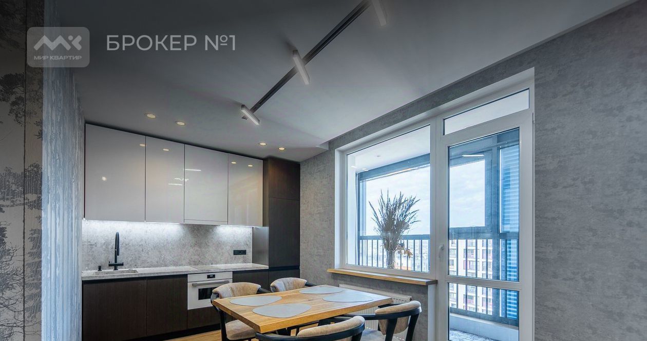 Кухня, оборудованная всей необходимой техникой, также имеет выход на панорамный застекленный балкон.