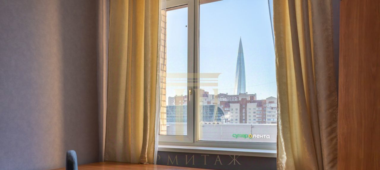 Панорамные виды: кухня/гостиная и балкон — на ул. Савушкина; из детской видно Лахта Центр; спальня — в тихий двор