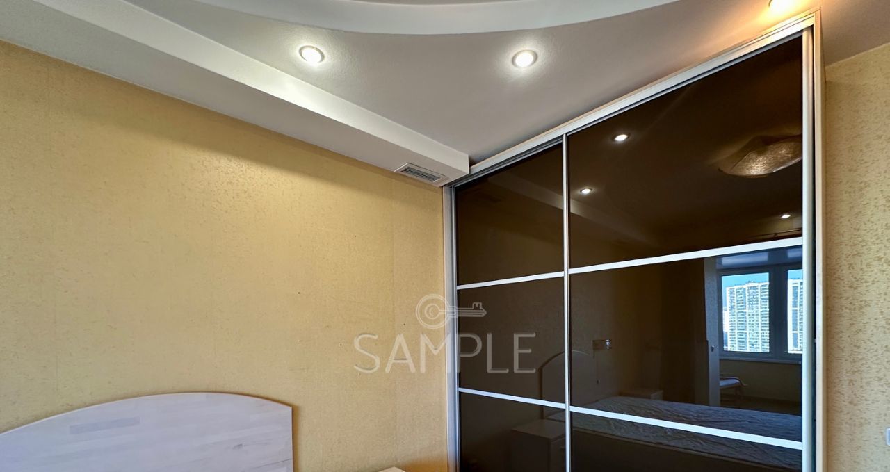 - Изолированная спальня с двуспальной кроватью с матрацем, прикроватными тумбами и шкафом-купе;