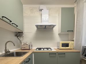 Полностью оборудованная кухня: Всё необходимое для готовки: холодильник, электрическая плита, духовой шкаф и микроволновая печь.