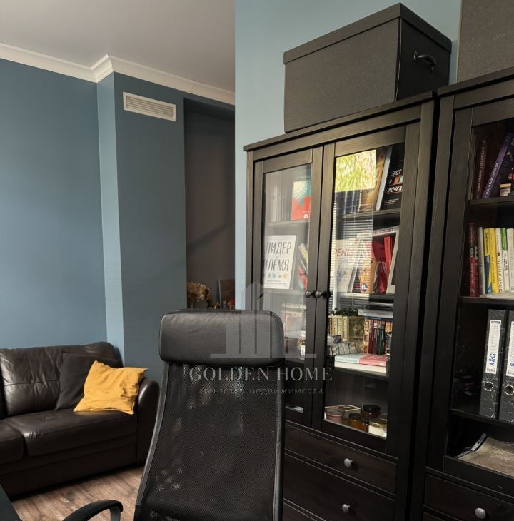 Кабинет идеален для удаленной работы (примерно 10 кв.м). Обустроен качественной мебелью для работы. Красивые книжные шкафы с витражами на фоне для рабочих созвонов. Диван, который раскладывается в спальное место для 2 человек на случай, если к вам приехали гости.