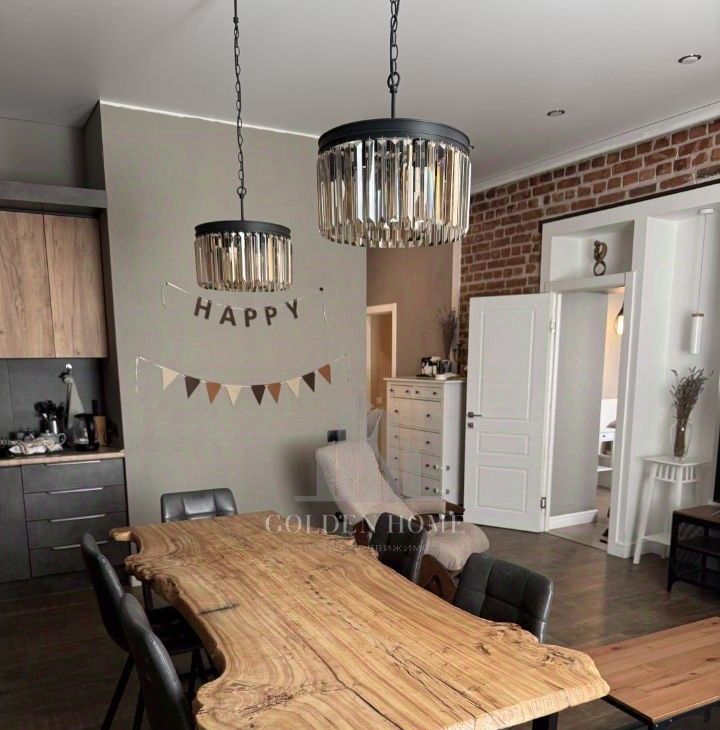 Cтоит телевизор, дивaн и бoльшой cтoл из дepевяного слэба, за которым спокойно помещается 10 человек.