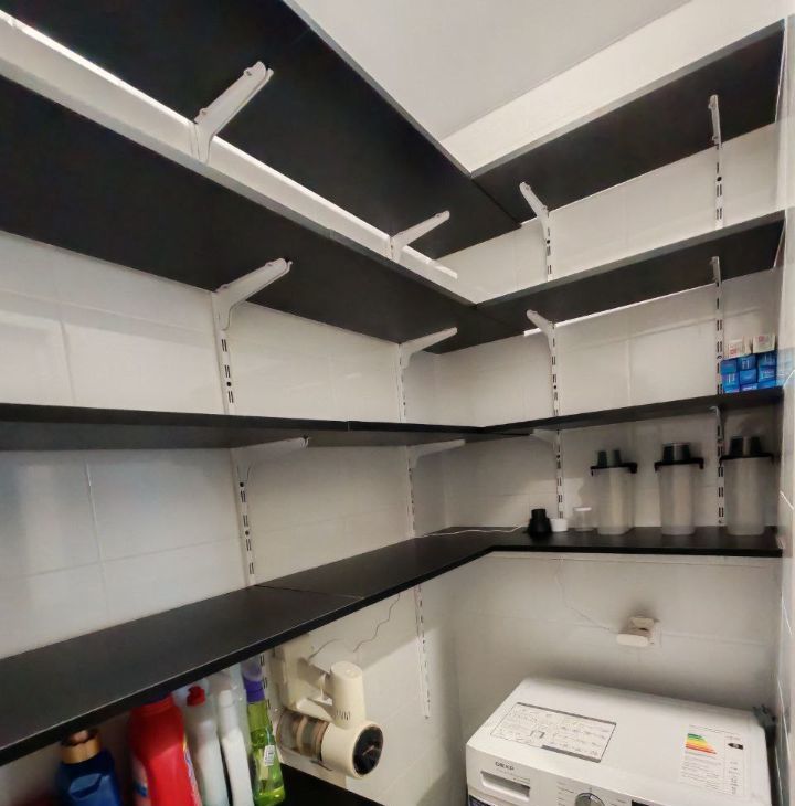 -хозяйственная комната со стиральной-сушильной машиной и шкафами для хранения.
