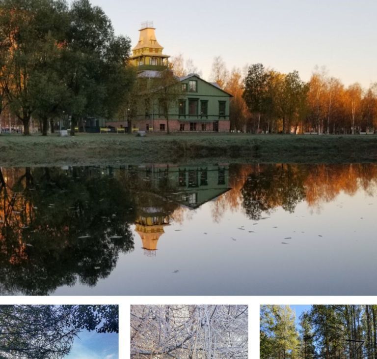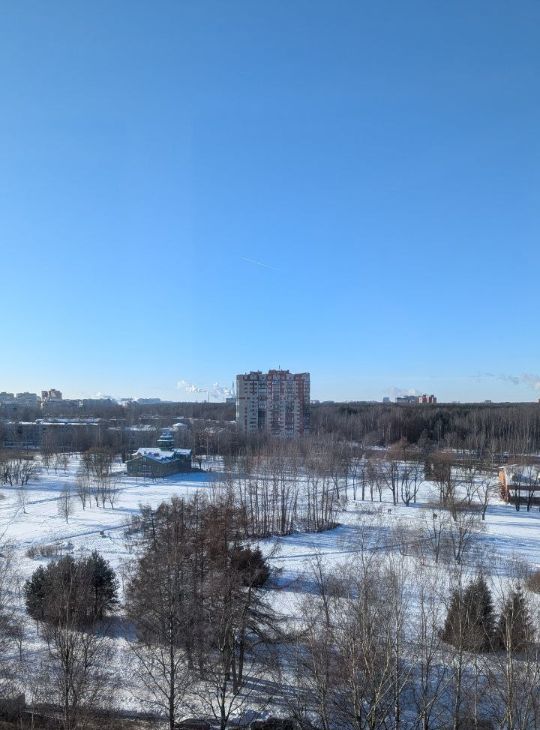 С лоджии открывается красивый вид на сад Бенуа и парк Сосновку — зелёная панорама без ощущения окна в окна.