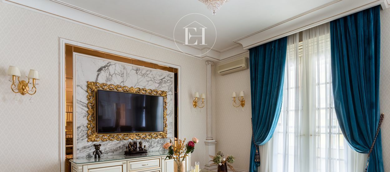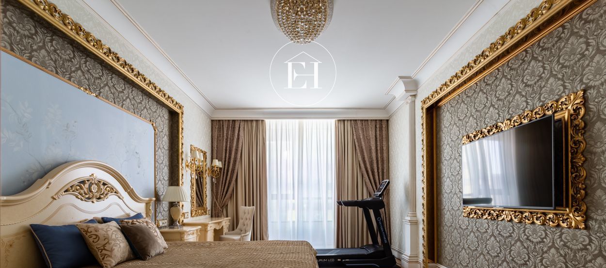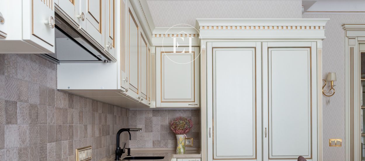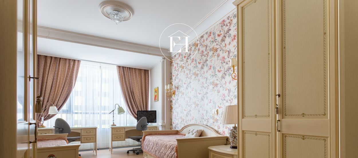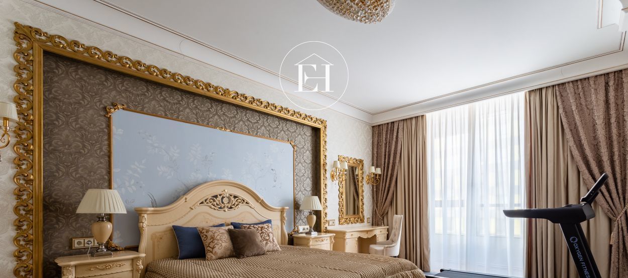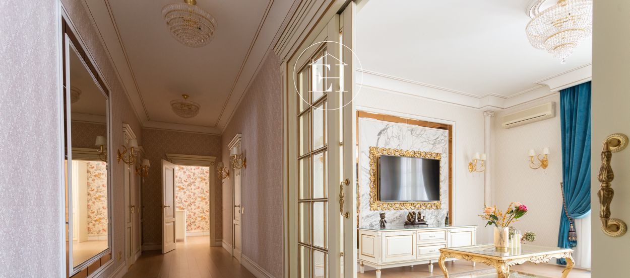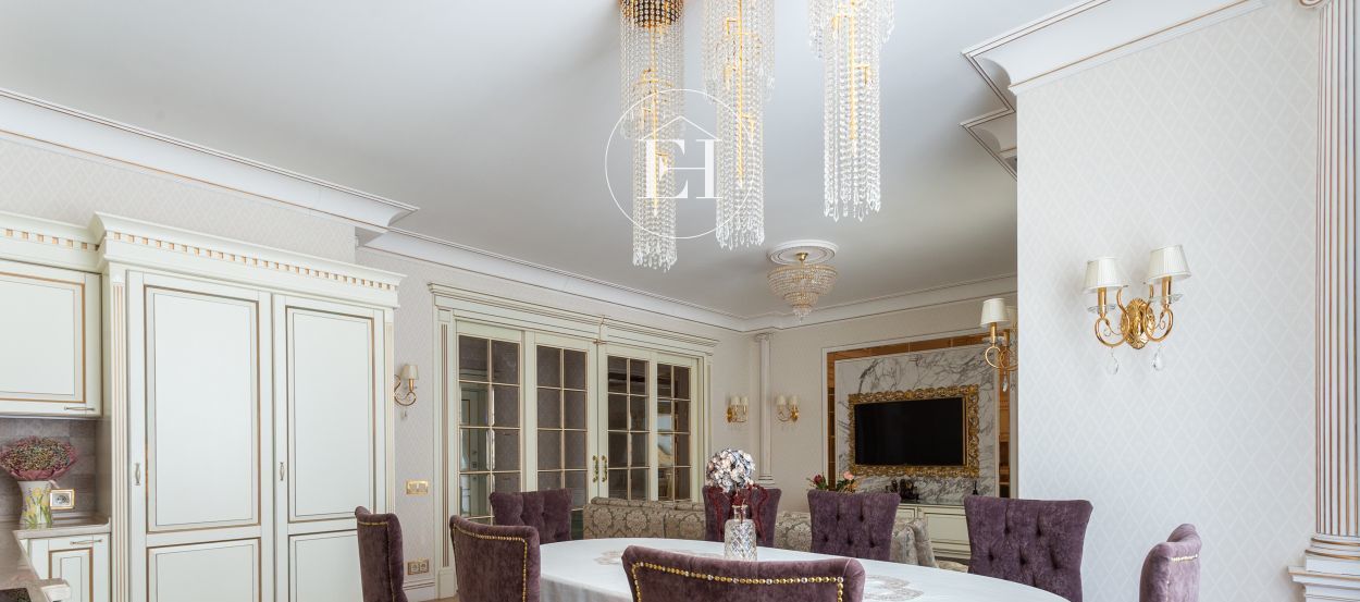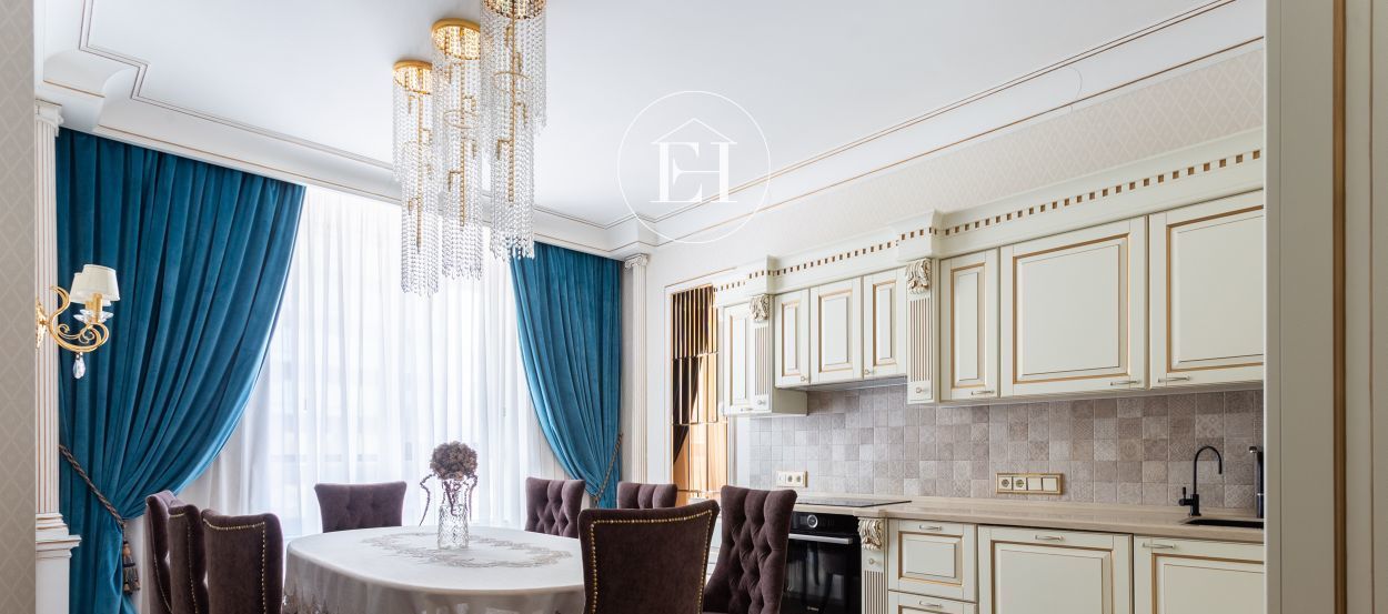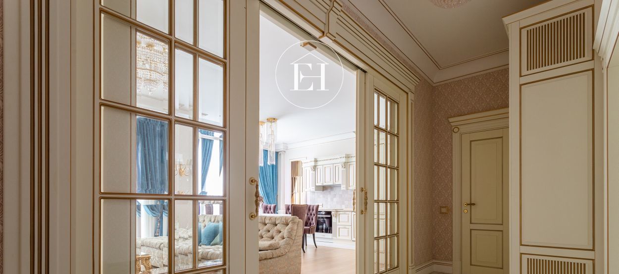 Интерьер выполнен по авторскому проекту в классическом стиле. Высота потолков — 3 метра, установлены панорамные окна.