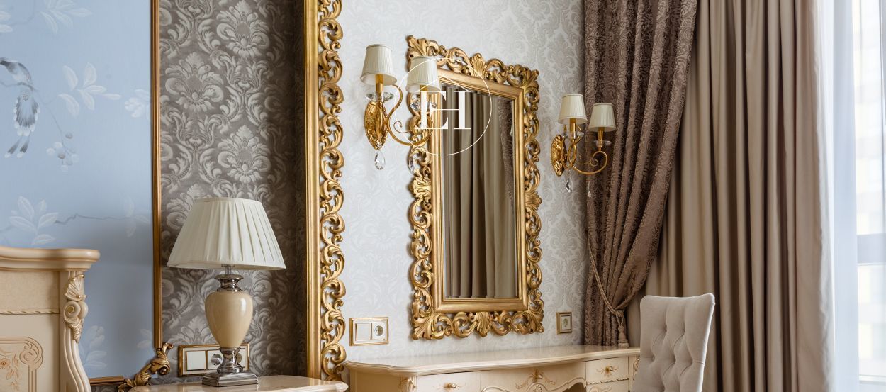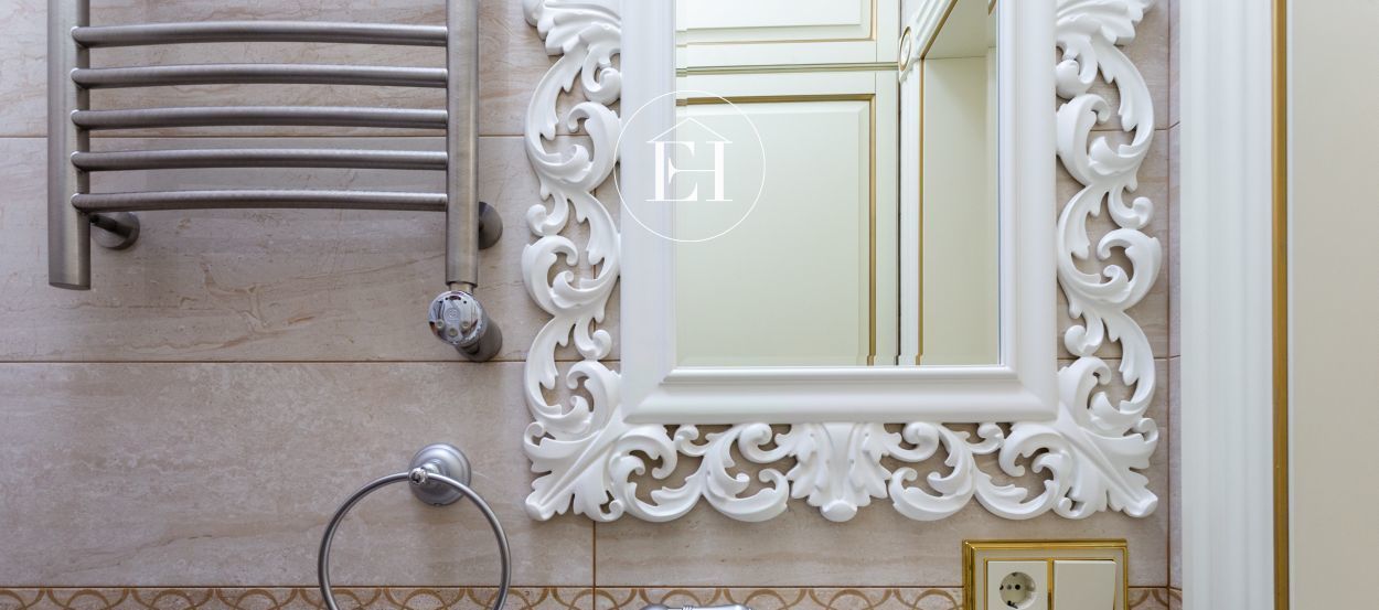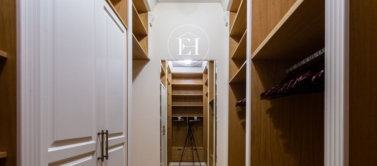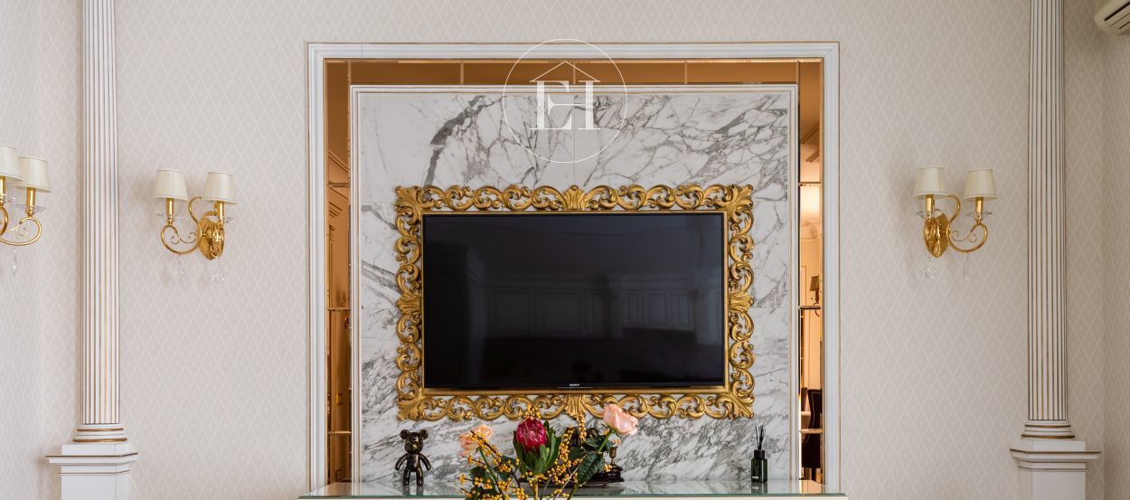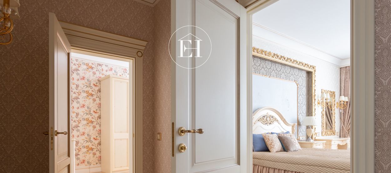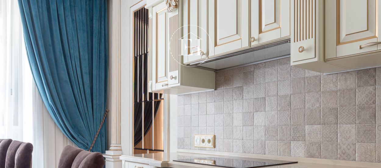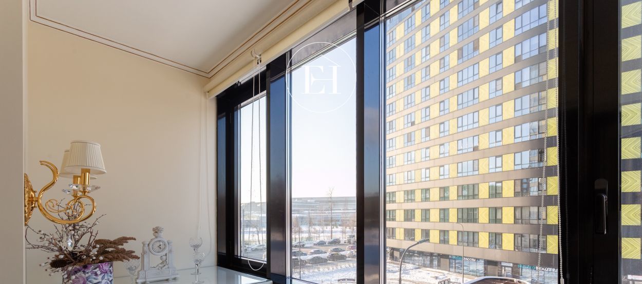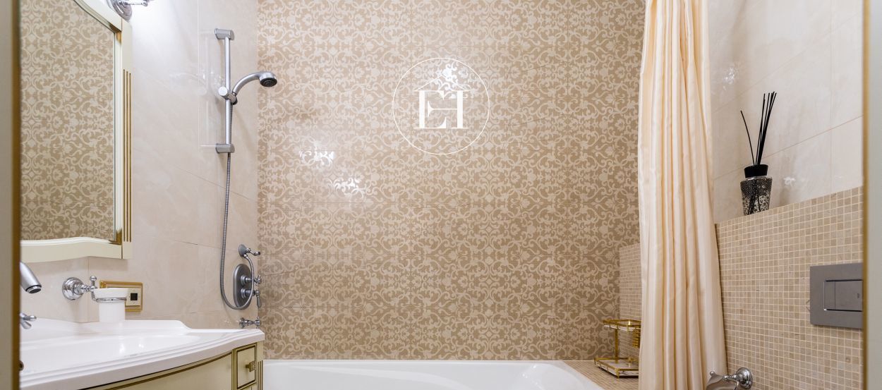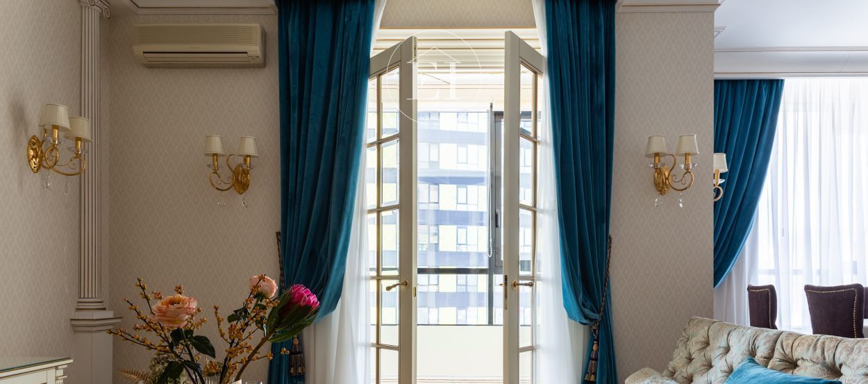 Интерьер выполнен по авторскому проекту в классическом стиле. Высота потолков — 3 метра, установлены панорамные окна.