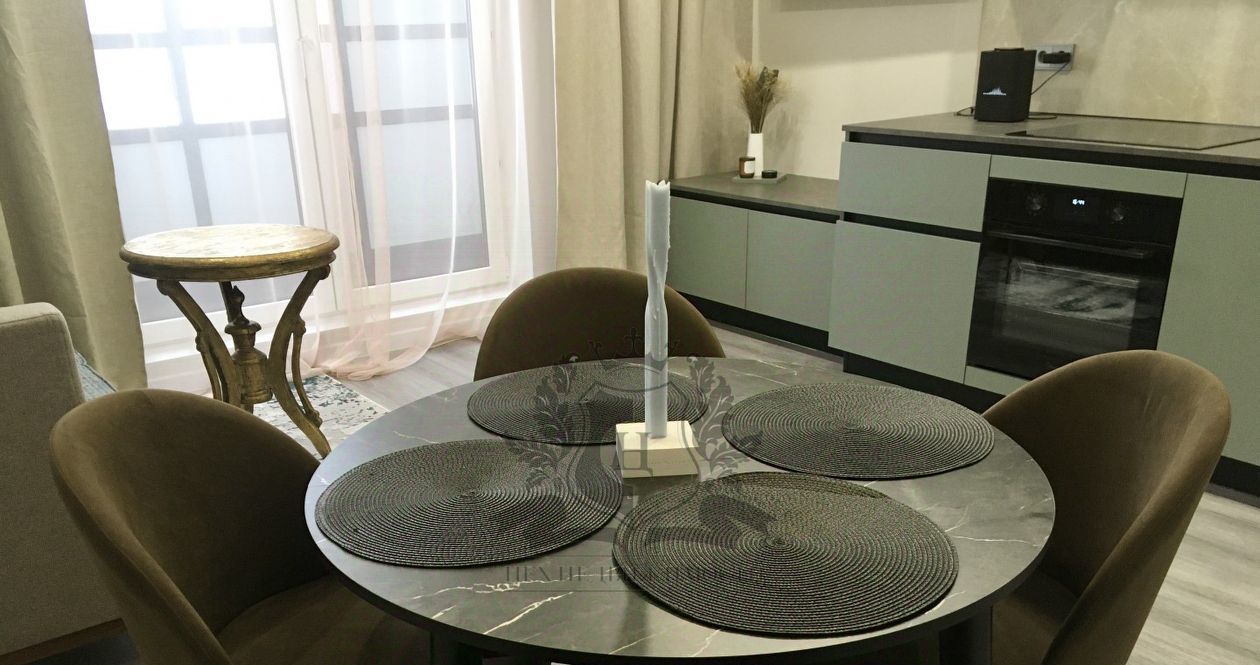 В квартире 3 жилой комнаты и кухня -гостиная с современной техникой Medea ,мебелью и набором посуды (духовка,электроплита ,посудомоечная машина,холодильник,вытяжной шкаф); спальная с двуспальной кроватью ,платяным шкафом ,большим во весь рост зеркалом ,кондиционером; комната-гостиная с диваном и авторскими работами современного художника ; одна из комнат поменьше - пустая ,без мебели. Её можно оборудовать под детскую или рабочий кабинет.(Собственник готов купить мебель под ваш запрос .Бюджет обсуждается).