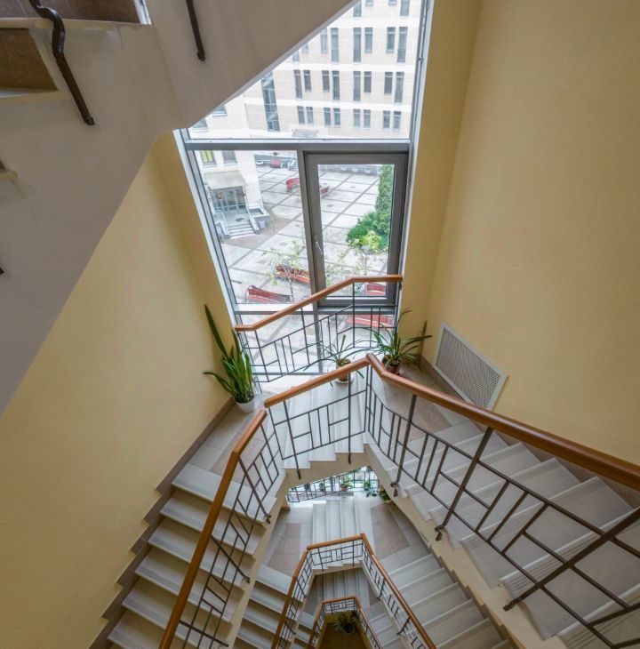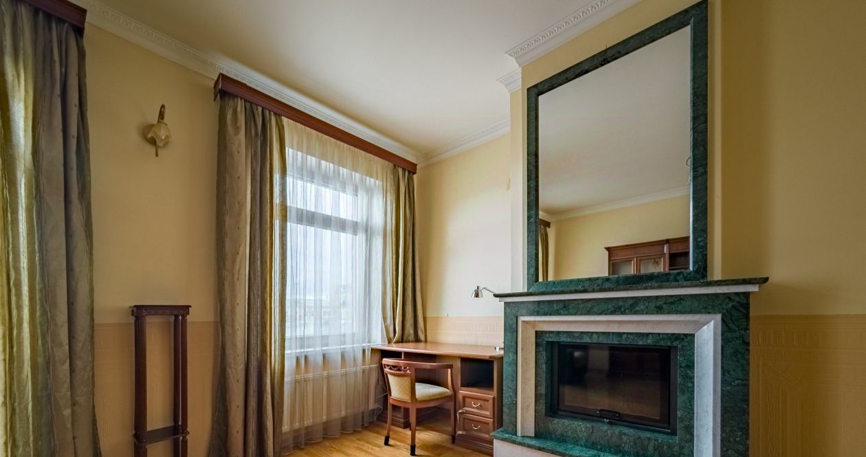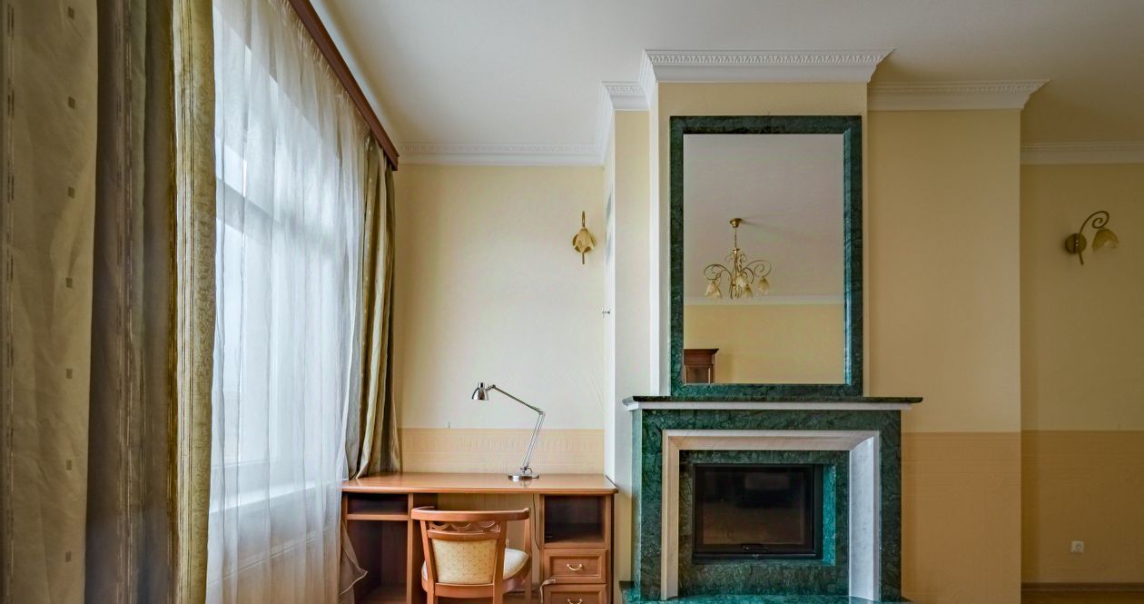 Планировка с кухней-гостиной, большой спальней и комнатой с действующим камином. Две совмещенные ванные комнаты, сауна, большие окна и высокий потолок.