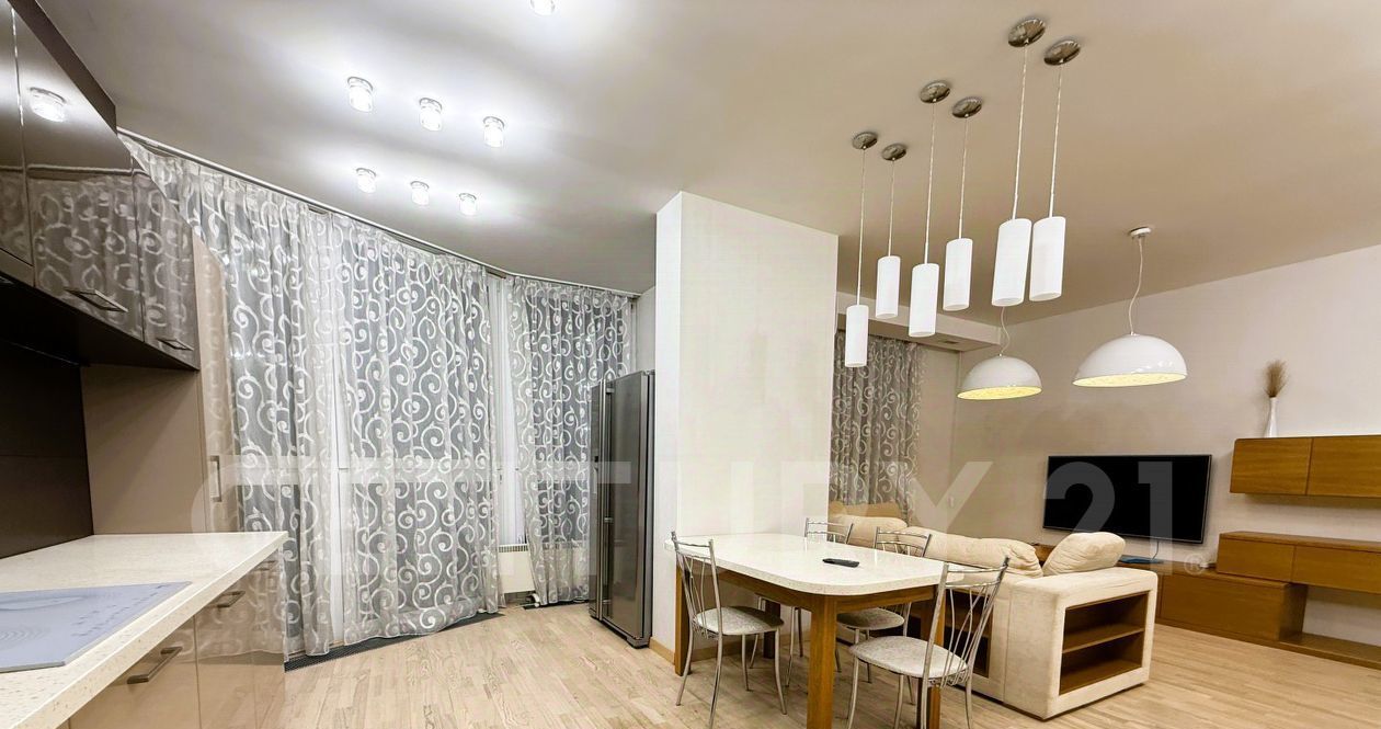 Большая кухня-гостиная 45 кв.м совмещена с лоджией, спальней 15 кв.м, детской 18.2 кв.м