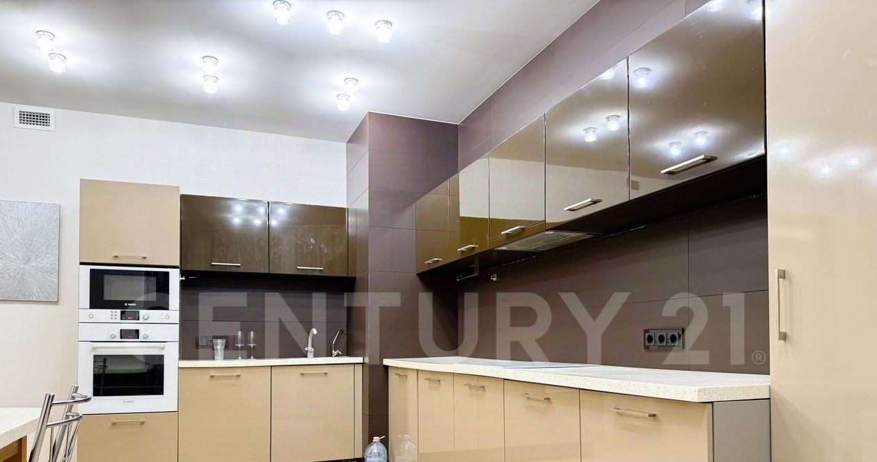 Стильная современная кухня с духовым шкафом, вытяжкой