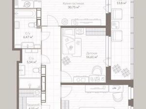 Просторная гостиная совмещена с прихожей, при наличии 3-х спален, Вы получаете 4-х комнатную квартиру с двумя санузлами (с ванной 8 кв. м и с душевой кабиной 5 кв. м), с двумя большими гардеробными и просторной кухней-столовой.