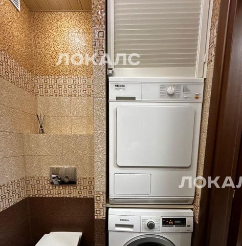В ванне установлена стиральная и сушильная машины, на кухне: ППМ, холодильник, духовка, индукционная плита, микроволновка, обеденный стол, стулья.