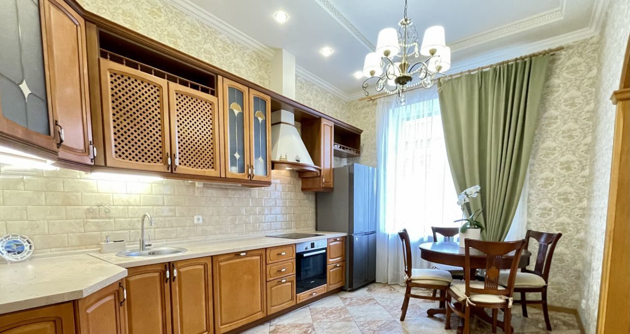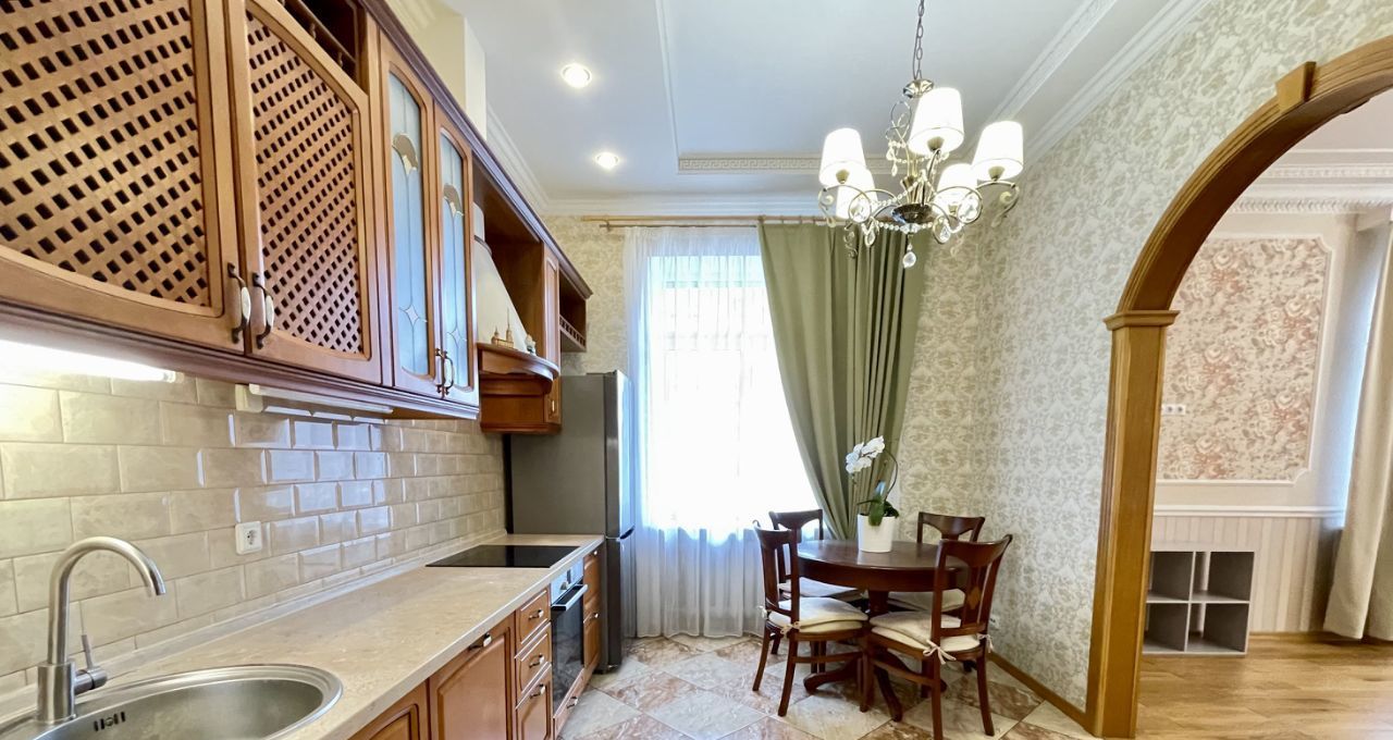 Уютная и просторная кухня в классическом стиле - 14,5 кв.м. оснащена всей необходимой бытовой техникой, включая варочную панель, духовой шкаф, посудомоечную машину, вытяжку, холодильник Side-by-Side.