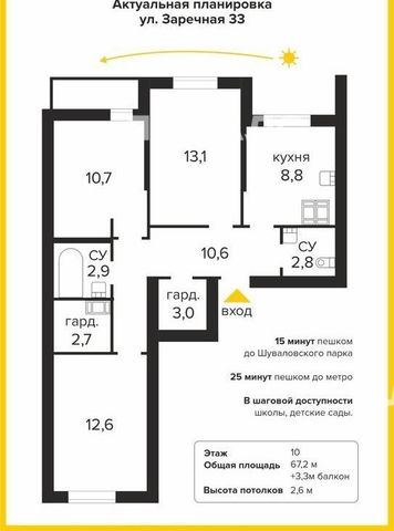 67,2м²+3,3 м² застекленный балкон