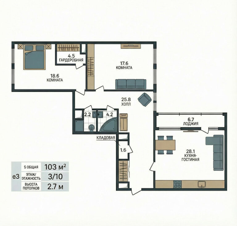 Удобная планировка. Спальни 17.6 и 18.7 м2. Прекрасное естественное освещение в течение всего дня, при этом даже летом Вы не будете страдать от невыносимой жары. Сделаны выводы для кондиционера. Имеется просторная лоджия длиной 6 м2 (дополнительно к общей площади квартиры).