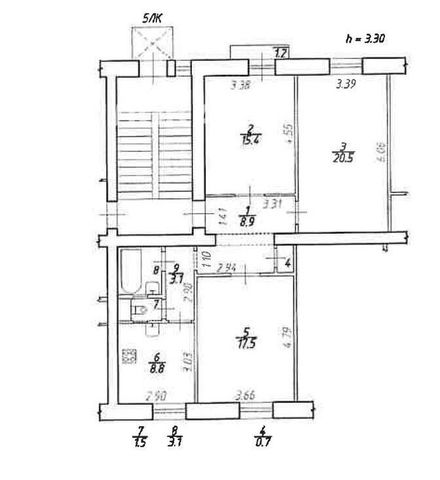 *Кухня 8,8м2; * Комната 17.5 м2 со встроенным шкафом купе; * Комната 15,4 м2 со встроенным шкафом, балкон; *Комната 20,5 м2; * Коридор 8,9 м2 со встроенным зеркальном шкафом; Раздельный санузел, в ванной комнате предусмотрена душевая. Для горячего водоснабжения установлен газовый водонагреватель. Высота потолков 3,3м. Стены: Обои, декоративная штукатурка.