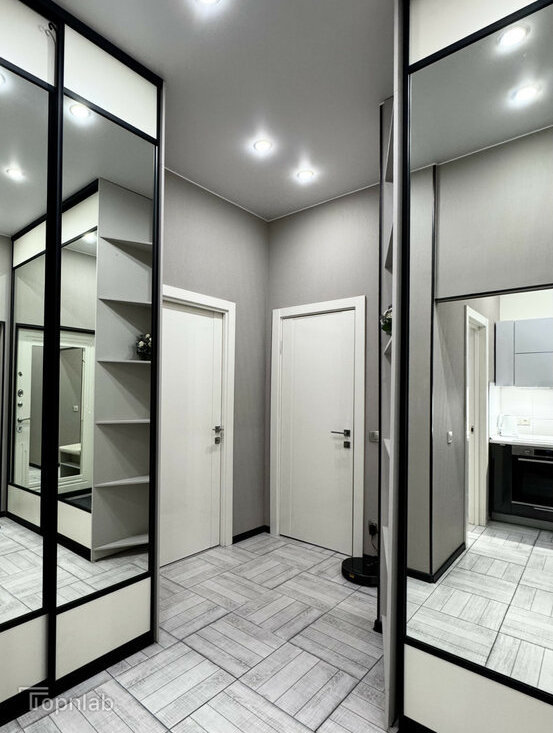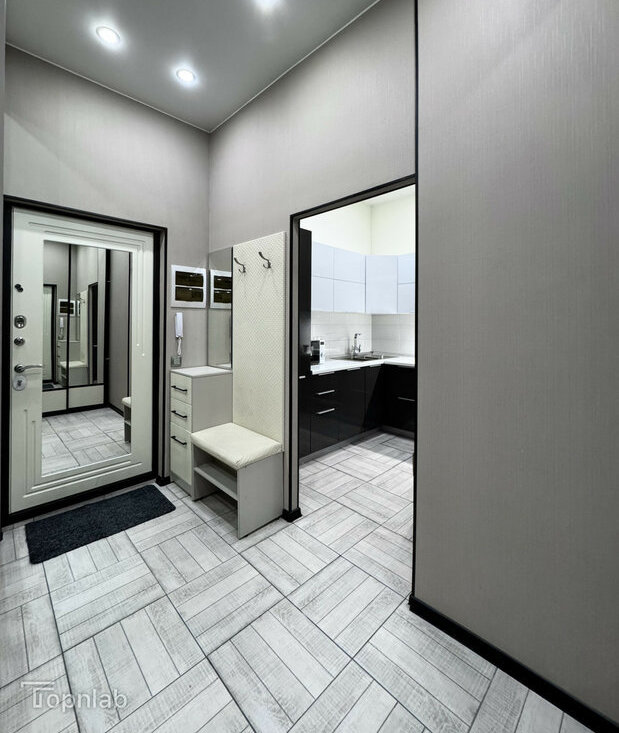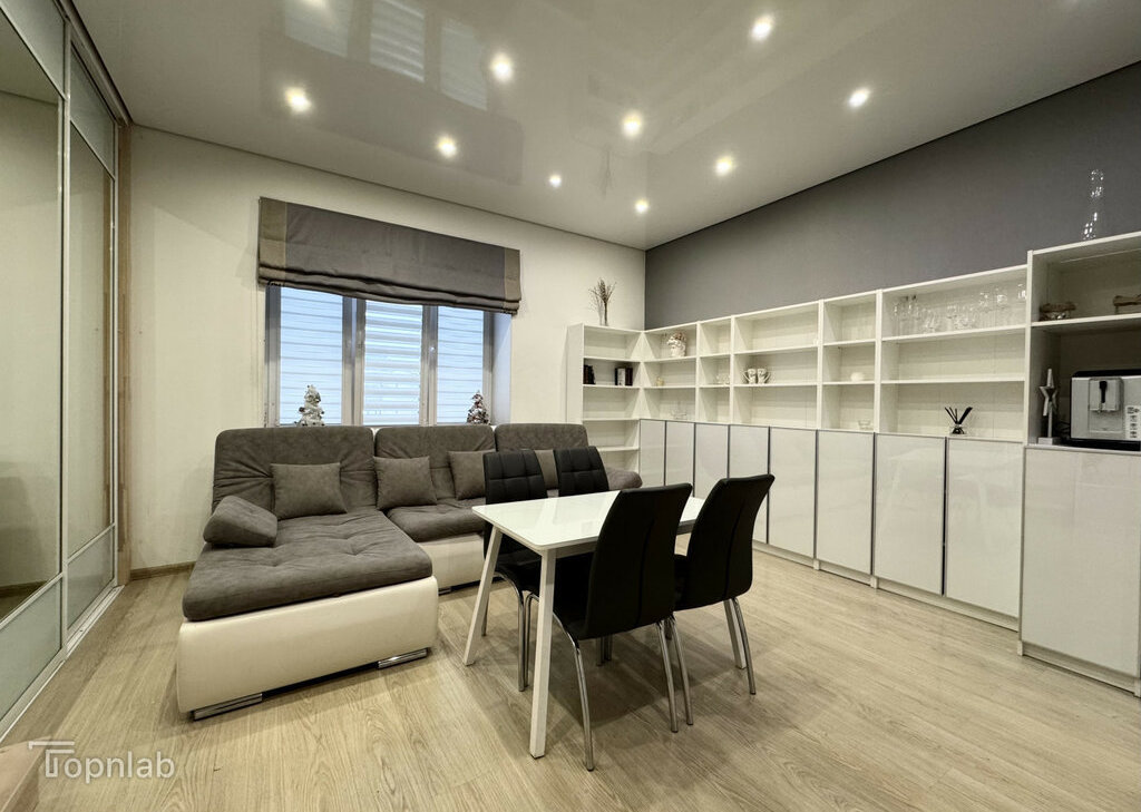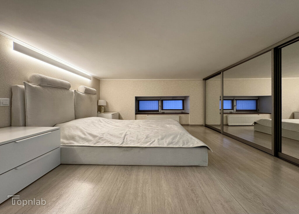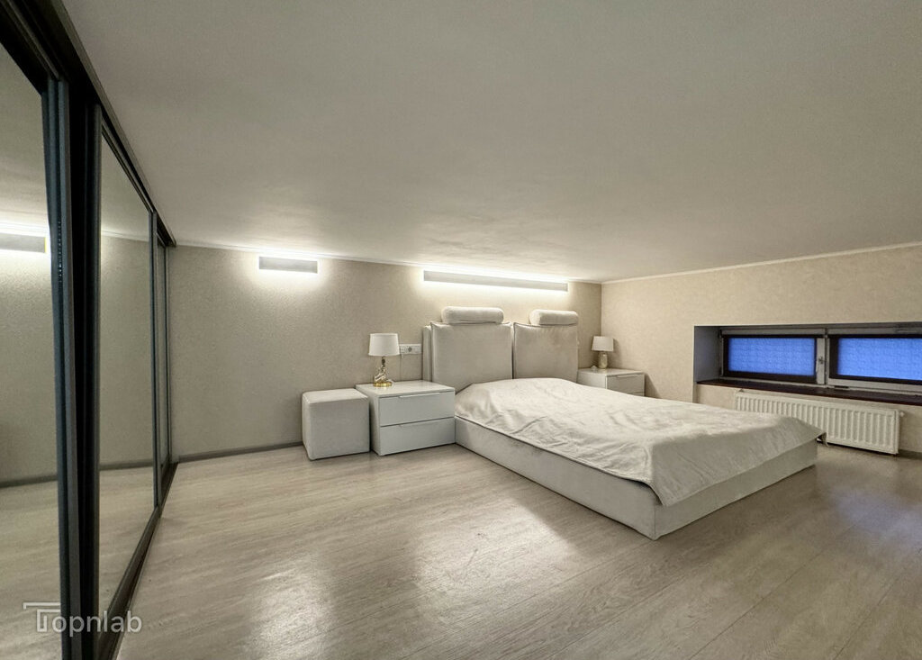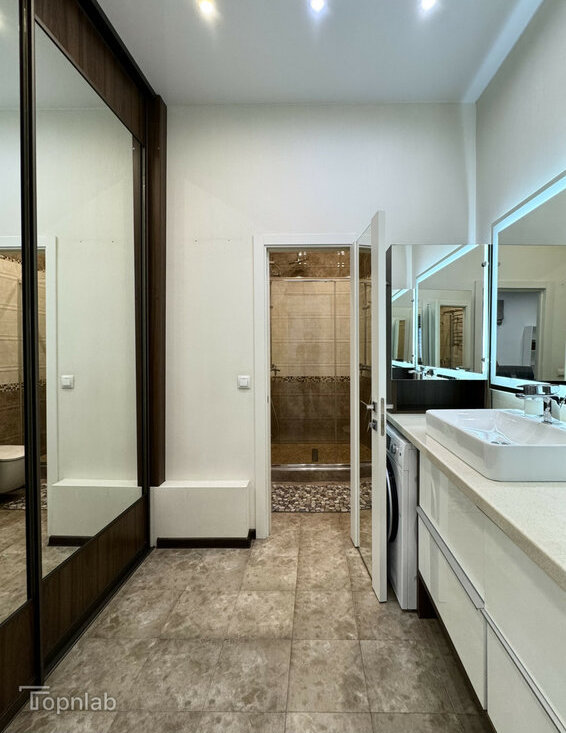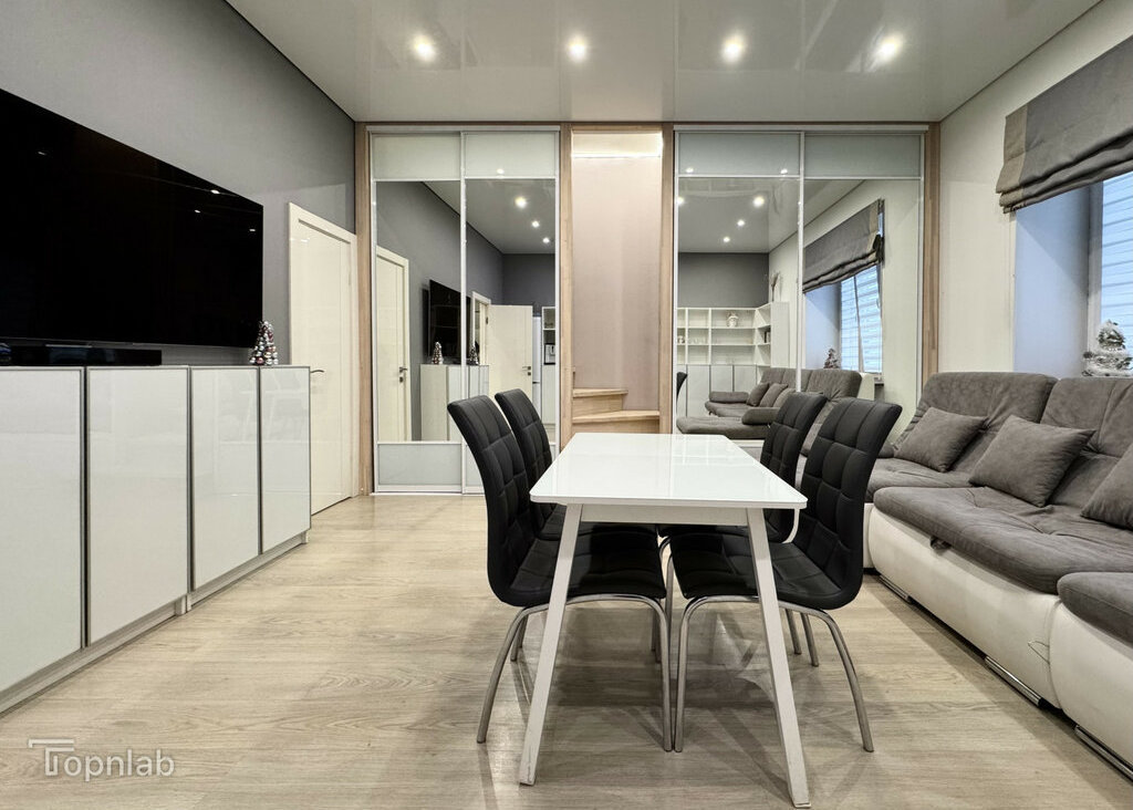 Планировка с кухней, совмещенной с большой гостиной, спальней на втором уровне и второй комнатой (детская или гостевая). Две ванные комнаты с душевой и ванной, совмещенный и раздельный туалет. В квартире много высоких шкафов и систем хранения, есть зона с визажным зеркалом. Техника: стиральная машина с функцией сушки, духовка, поcудомоечная (всё BOSCH), индукционная плита, холодильник, большой телевизор (всё Samsung).
