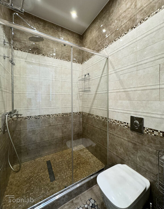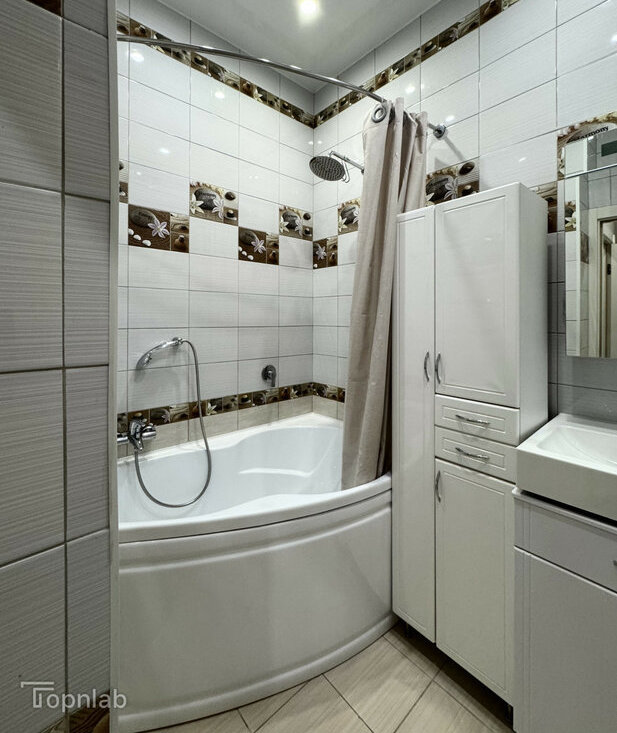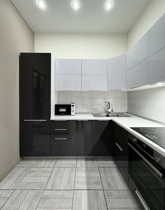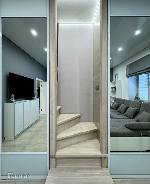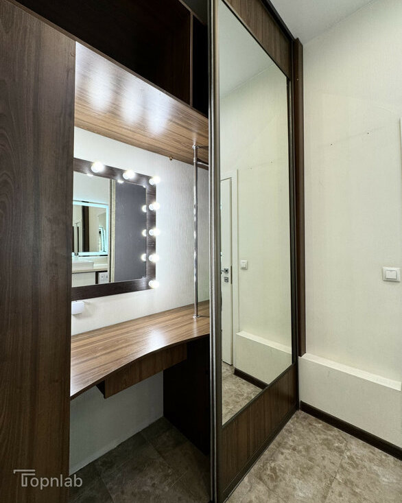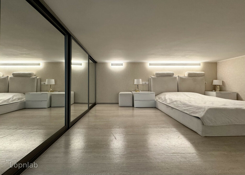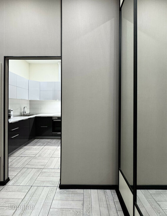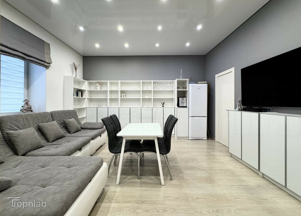 Планировка с кухней, совмещенной с большой гостиной, спальней на втором уровне и второй комнатой (детская или гостевая). Две ванные комнаты с душевой и ванной, совмещенный и раздельный туалет. В квартире много высоких шкафов и систем хранения, есть зона с визажным зеркалом. Техника: стиральная машина с функцией сушки, духовка, поcудомоечная (всё BOSCH), индукционная плита, холодильник, большой телевизор (всё Samsung).