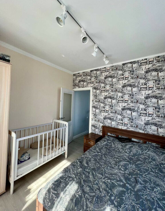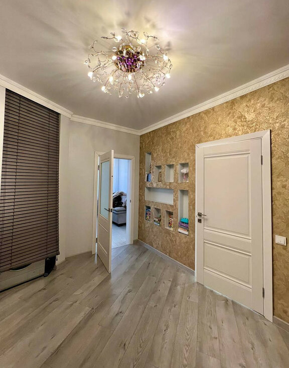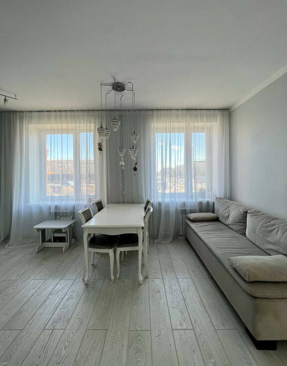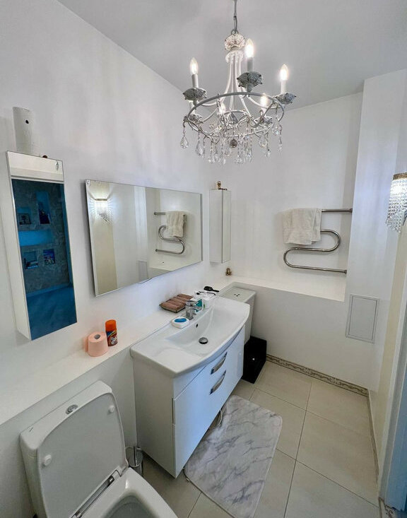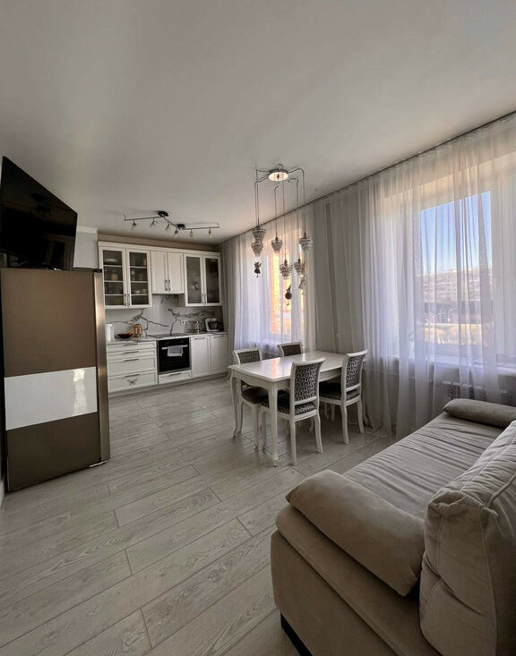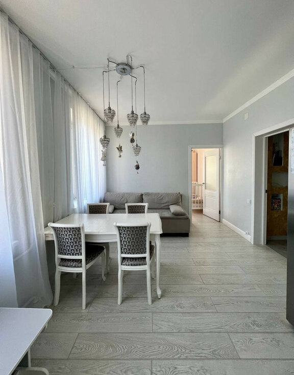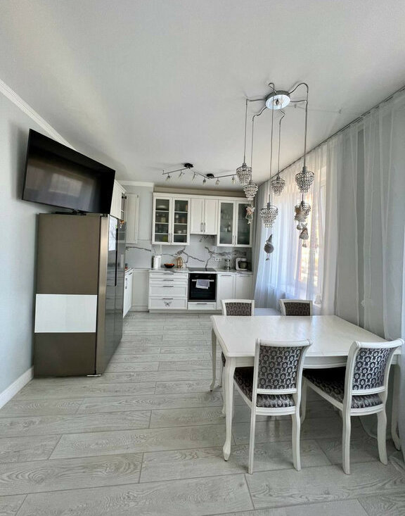 Светлая евротрешка 70 метров. Дизайнерский ремонт, вся техника остаётся. Две изолированные спальни + просторная гостиная. Метро «Дыбенко» — реально 5 минут пешком.