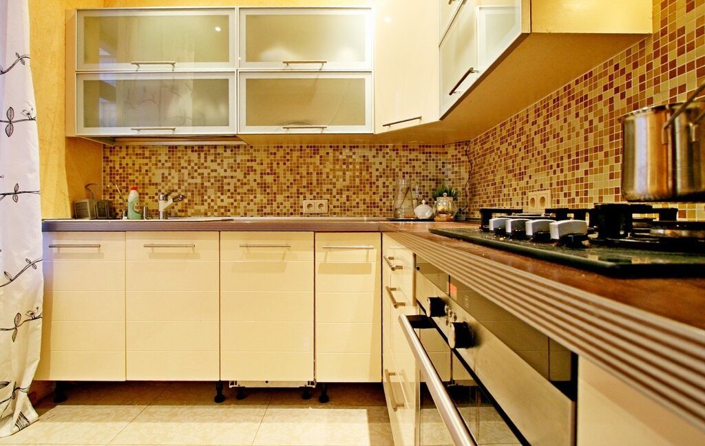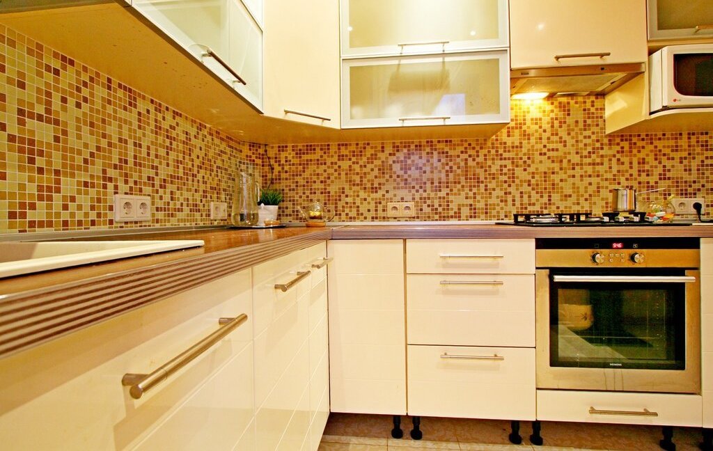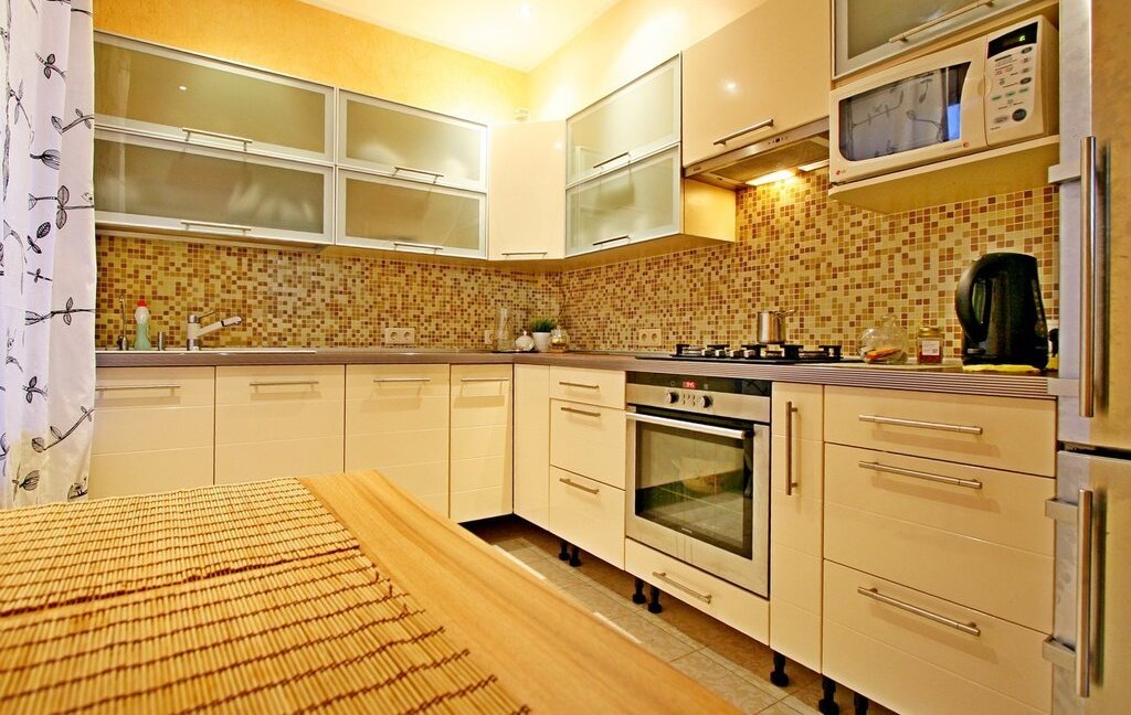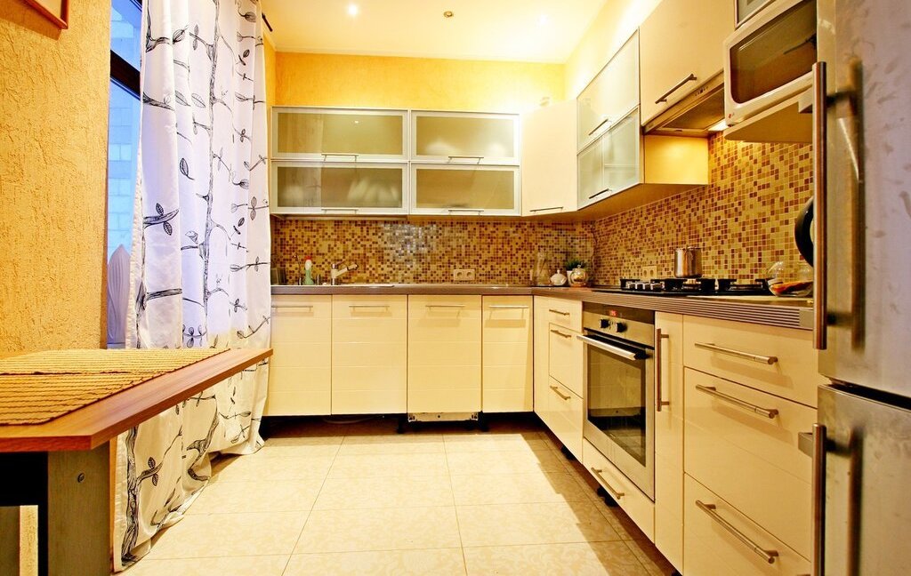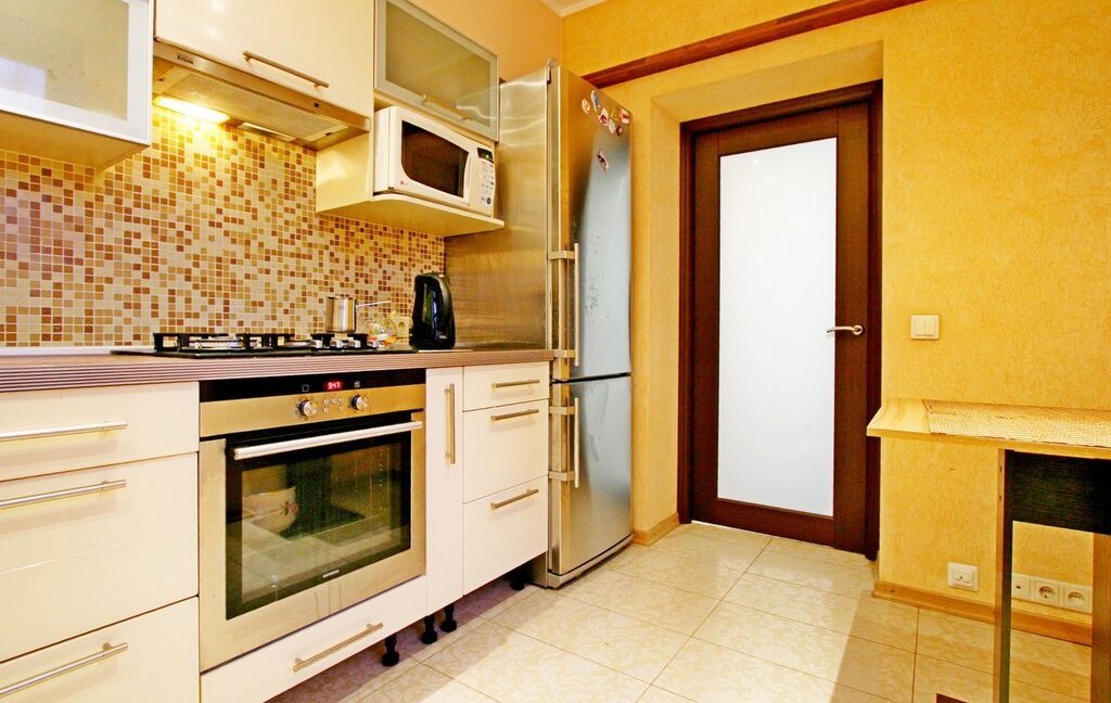 Кухня оборудована всем, необходимым для комфортного проживания оборудованием - посудомоечная машина, плита, духовой шкаф, холодильник, вытяжка, микроволновая печь. Из гостиной есть также выход на застекленный балкон с потрясающими видами на Диво остров и Елагинский остров. Остекление балкона выполнено по безрамной технологии Lumon.