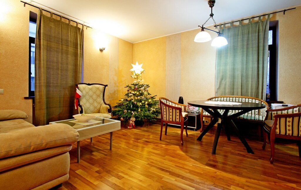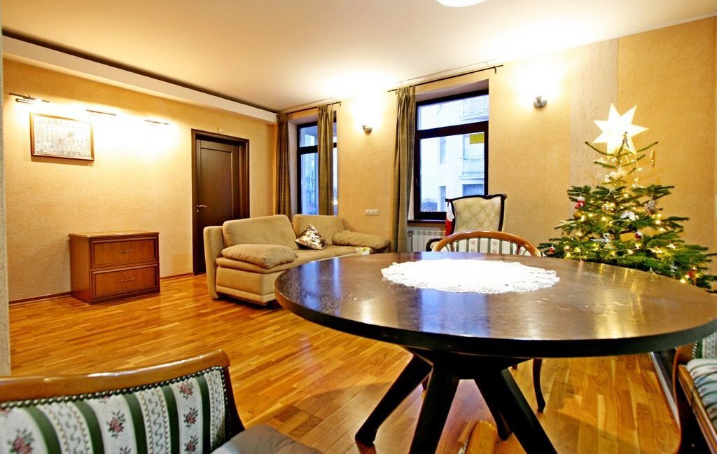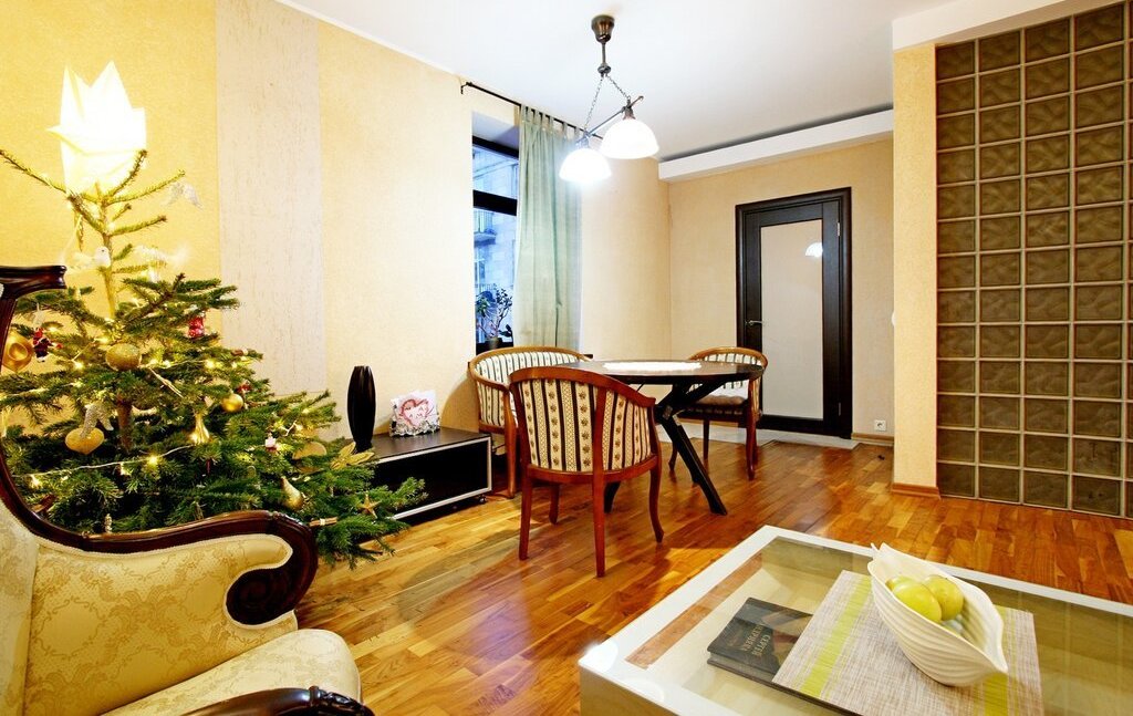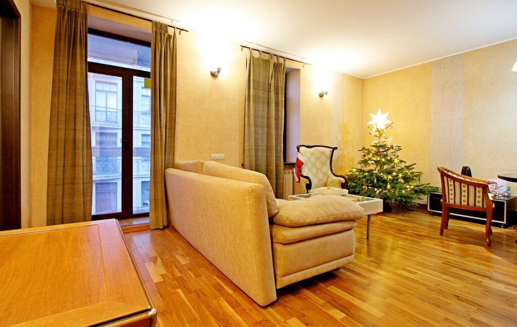 В квартире выполнен дизайнерский ремонт, вся планировка продумана до мелочей. Из квадратной формы просторной гостиной с тремя окнами имеется выход на кухню и спальную комнату со своей гардеробной.