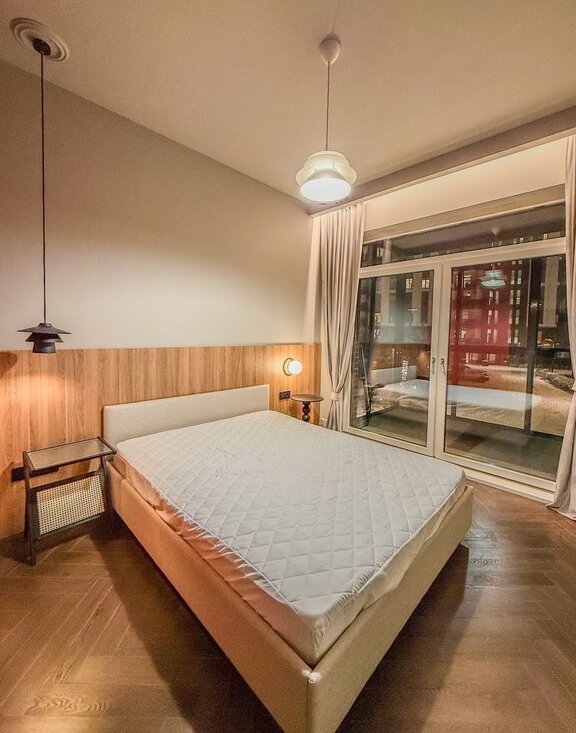 Квартира расположена на 2 этаже. Общая площадь 85.1 кв.м. Просторная кухня-гостиная, 2 изолированные комнаты, 2 санузла. Одна из комнат-Мастер-спальня с гардеробной. Есть лоджия. Вторая комната пустая. В квартире есть вся необходимая мебель и бытовая техника для комфортного проживания. Высота потолков 3 метра. Все окна квартиры выходят в тихий двор. В квартире только что закончен ремонт. Ранее никто не проживал.