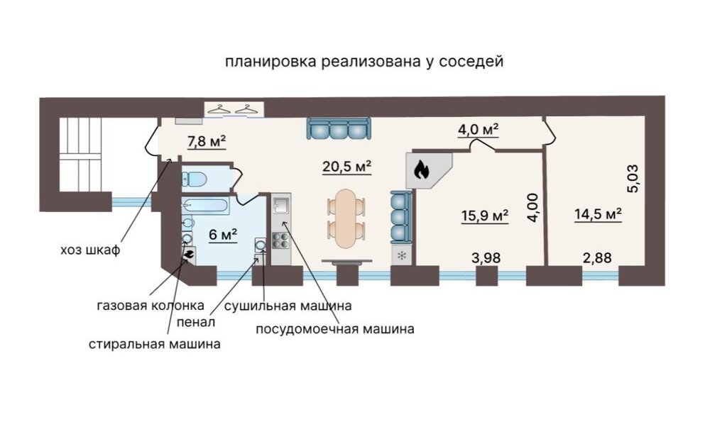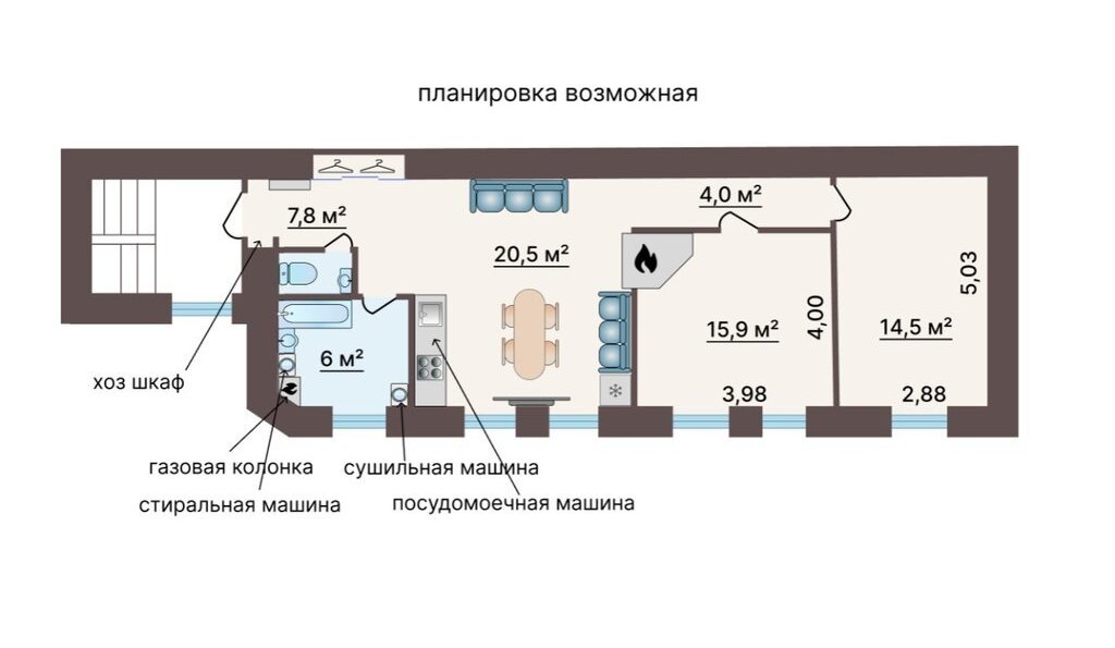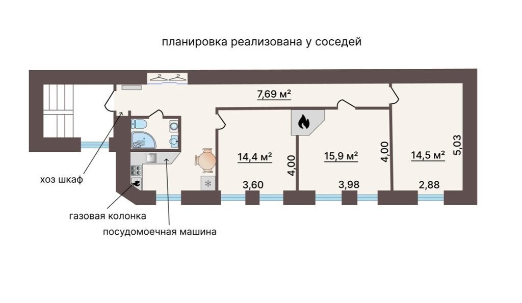 Возможно перепланировать в отличную 2-х ккв с большой кухней-гостиной, с печью (есть) или современным камином. Смотрите в объявлении фото с проектами перепланировок, в том числе, и уже реализованные у соседей планировки.