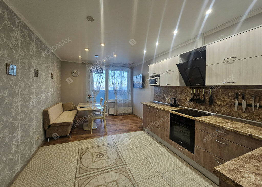 Полностью оборудованная кухня(18 м) с посудомоечной машиной.
