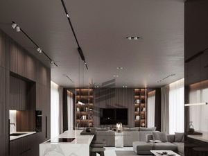 Бытовая техника на высшем уровне. Мебель сделана на заказ. На полу паркет. Шторы из Итальянских тканей. А антураж добавляет Лепнина и Люстра.