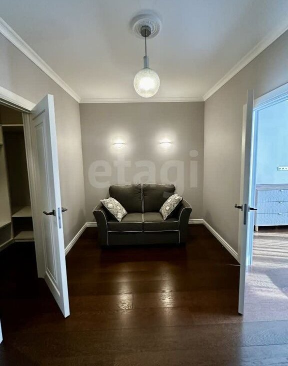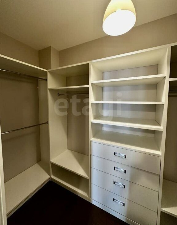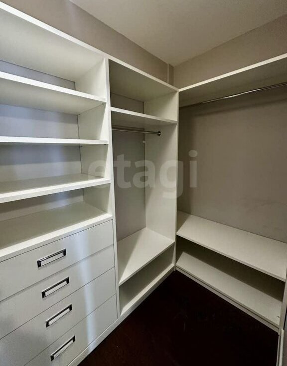 Планировка включает в себя просторную кухню-гостиную, две изолированные комнаты (спальня и детская), две вместительные гардеробные и две ванные комнаты (в одной установлена душевая кабина, в другой ванная).