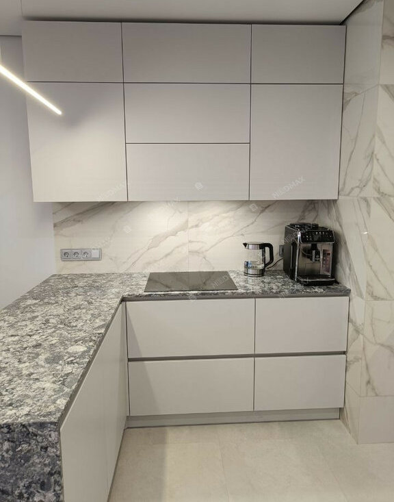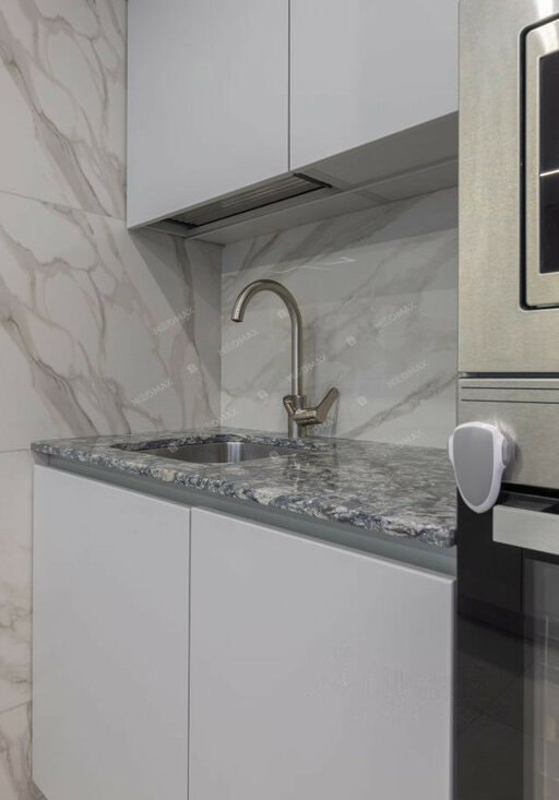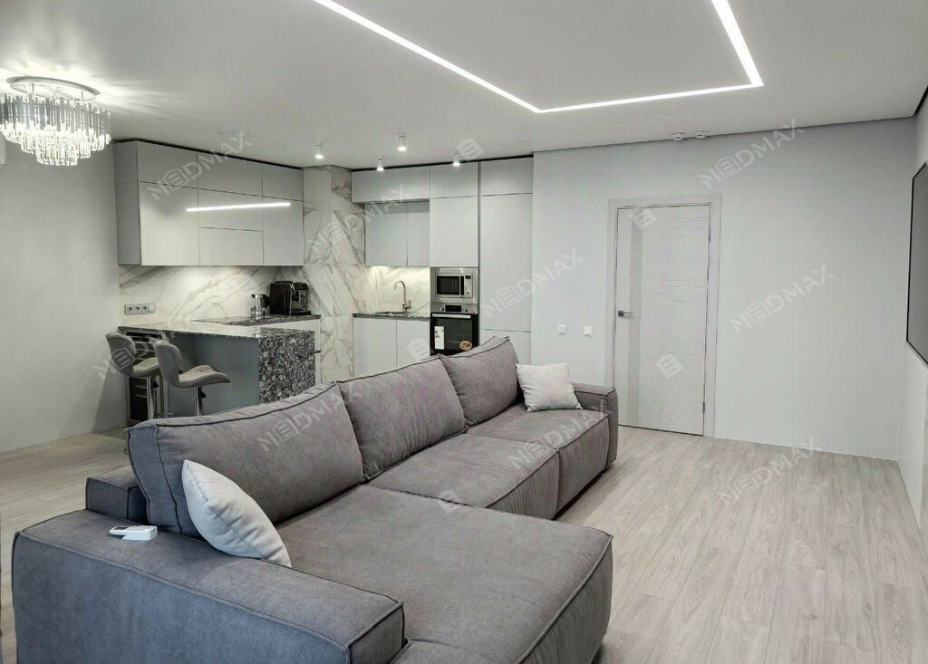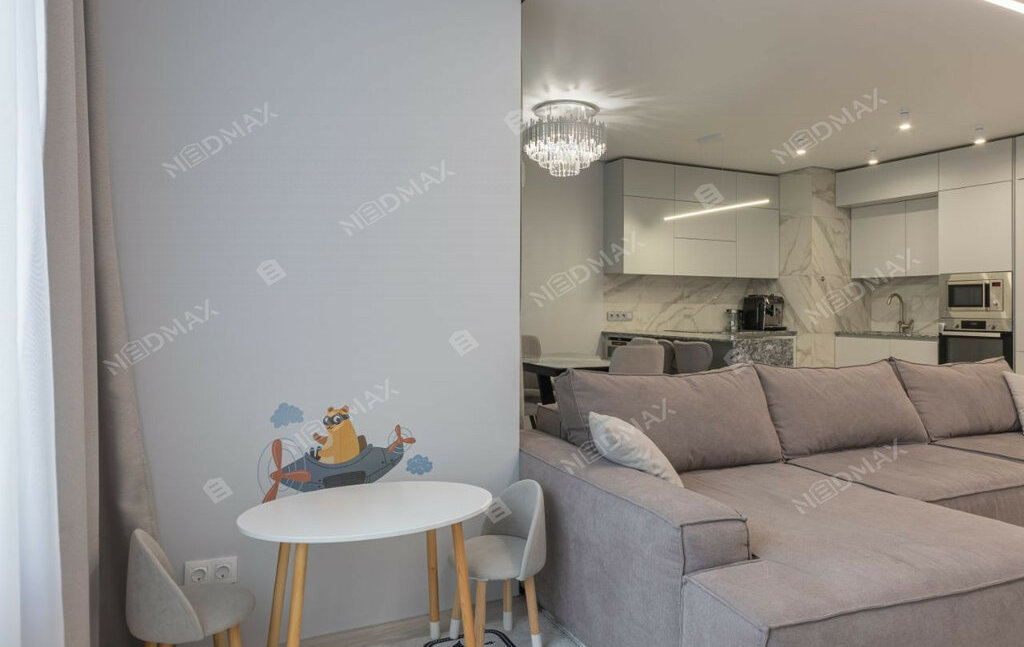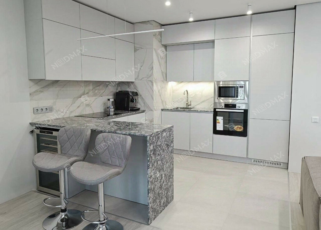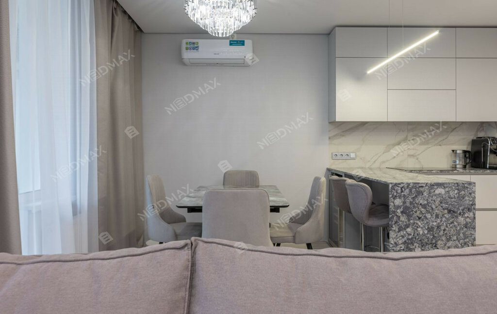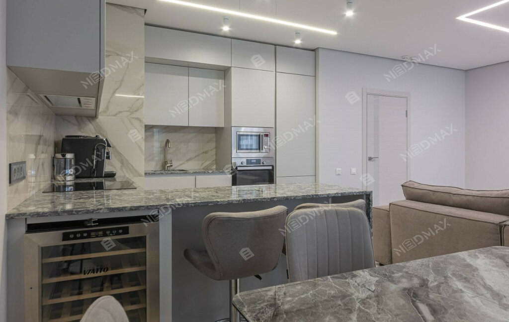 • Просторная гостиная-кухня (35 м²): С визуальным зонированием, тёплым полом в кухонной зоне и встроенной техникой. Кухня оборудована варочной панелью Indesit, духовым шкафом, посудомоечной машиной и холодильником LG. Качественная столешница из кварцевого агломерата устойчива к царапинам и высоким температурам. Барная стойка с удобными стульями и винным шкафом добавляют уюта.