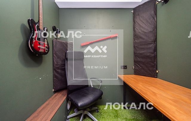 К гостиной примыкает небольшой звукоизолированный кабинет , с правильной аккустикой помещения для записи музыки, подкастов или работы со звуком. Можно использовать как комнату для игры в компьютер спрятавшись от семьи.