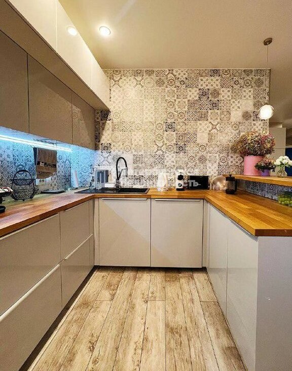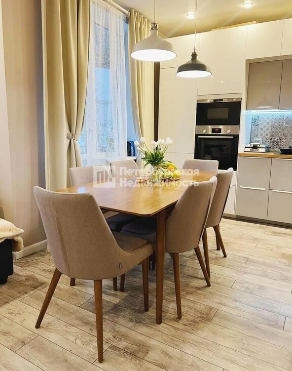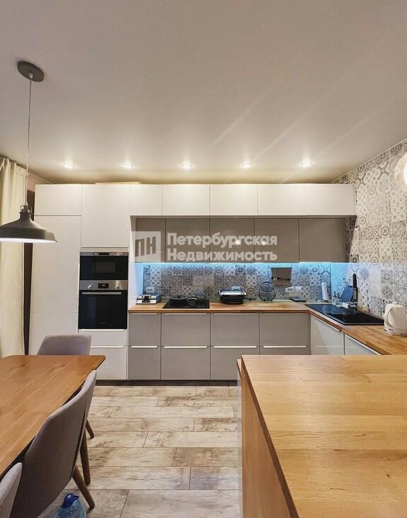 Квартира угловая, двусторонняя. В квартире есть отдельная комната-гардеробная для хранения, указана на фотографиях. Два санузла: раздельный и совмещенный. Большая кухня-гостиная с выходом на балкон. В ванной установлен теплый пол с терморегулятором. Кухня укомплектована встроенной техникой и разделена на зону бара и обеденную.