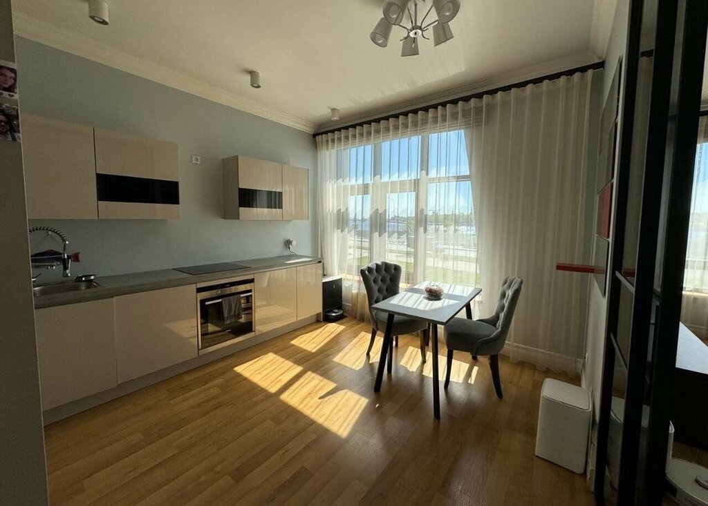 Интерьер выполнен с вниманием к деталям: итальянская кухонная гарнитура, полный комплект встроенной техники (посудомоечная машина, холодильник, духовой шкаф, варочная поверхность), дизайнерские шторы на заказ. Реализована система «умный дом», автоматически регулирующая освещение, подогрев полов и температуру радиаторов для поддержания идеального микроклимата.