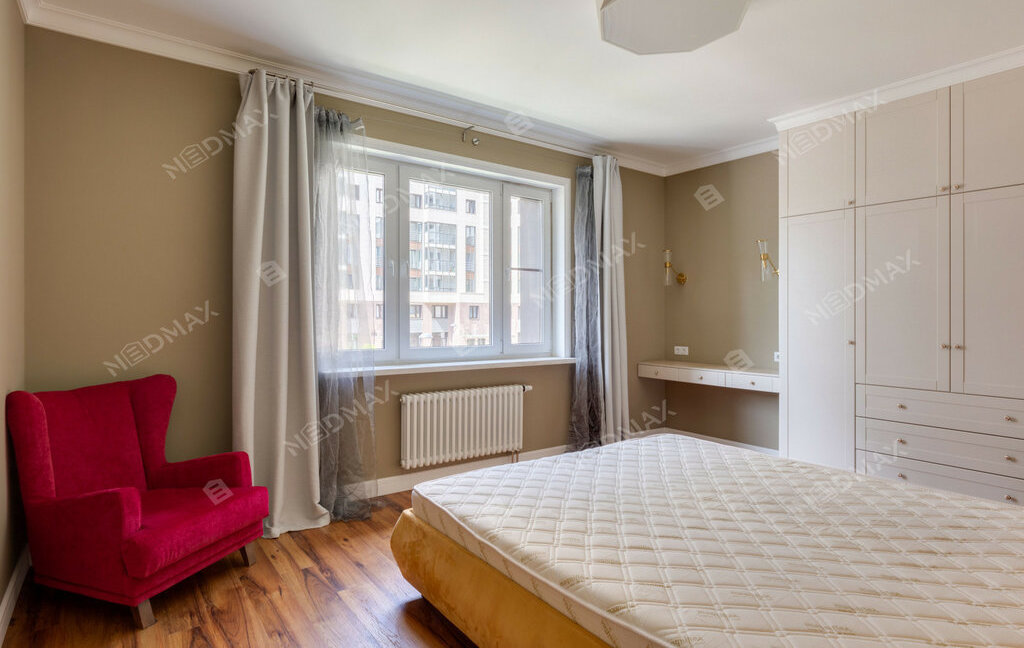 Планировка - спальная комната, кабинет, гостиная, оборудованная кухня (посуд.машина), гардеробная комната, просторный санузел с ванной. Теплый пол. Видеонаблюдение, охраняемая территория. Закрытые от машин дворы, отапливаемый паркинг, магазины и сервисы на первых этажах. Территория ЖК примыкает к набережной Большой Невки. В пешей доступности Приморский парк 300-летия, Крестовский, Лахта.