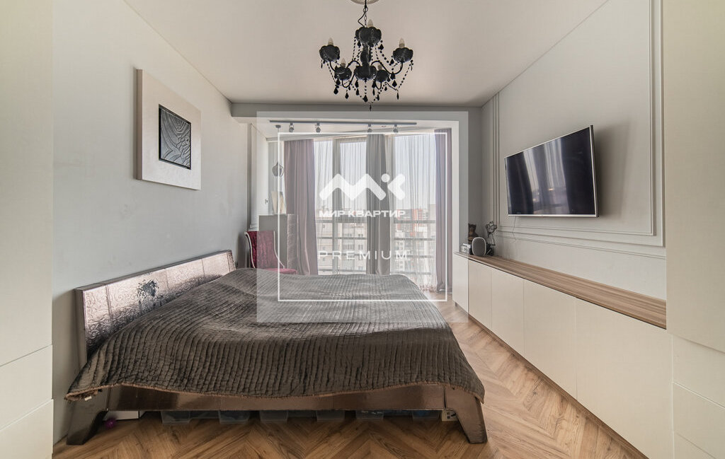 Планировка включает в себя две изолированные комнаты, совмещенный санузел с ванной и просторную кухню-гостиную с панорамными окнами.