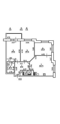 Общая площадь по ЕГРН составляет 82,5 м². Комнаты изолированные: 15 м² и 15,4 м², 12,2 м², кухня - 26,3 м², прихожая - 8,4 м². Санузел с душевой 2,2 м², санузел с ванной 4,2 м². Потолки - 2,7 м.